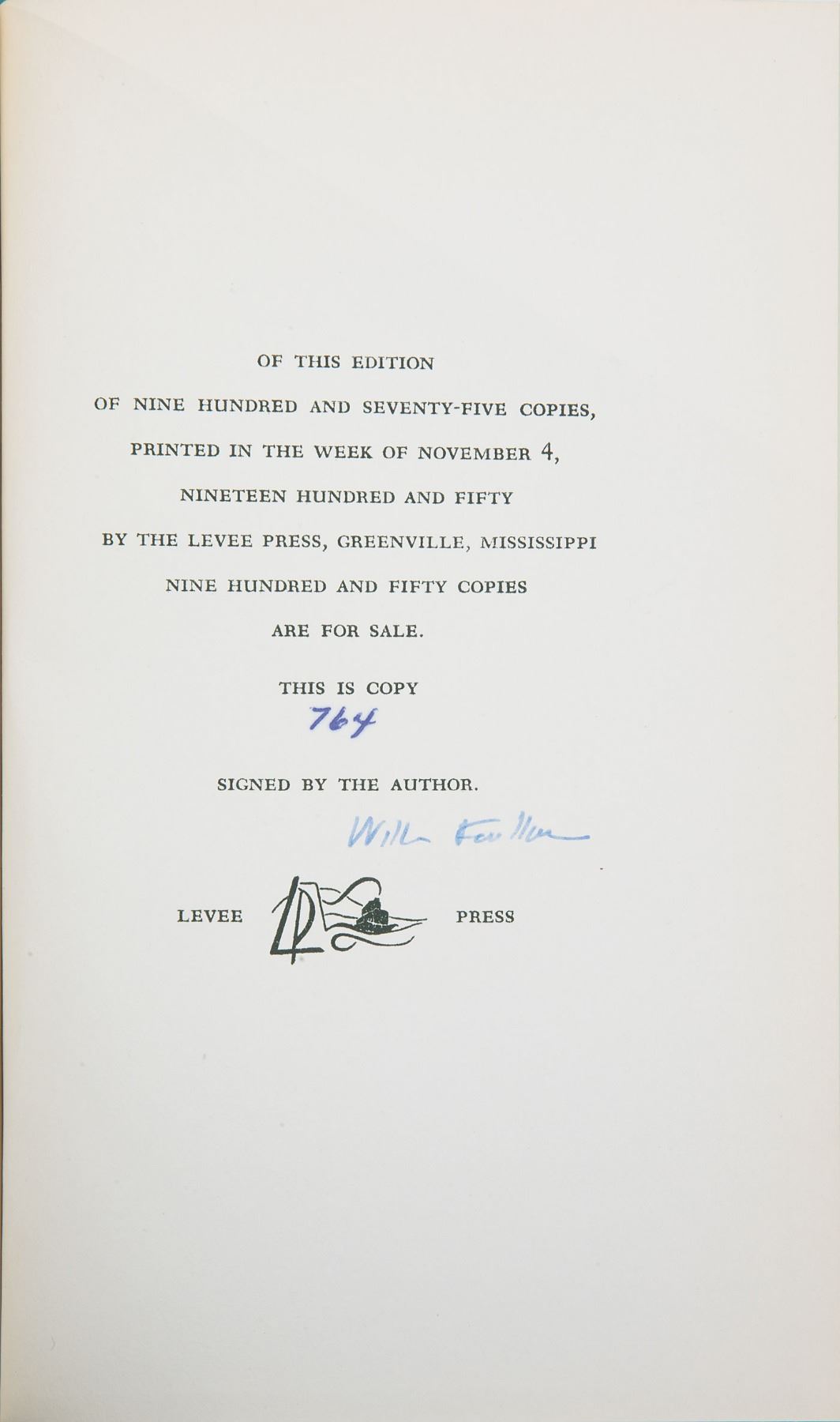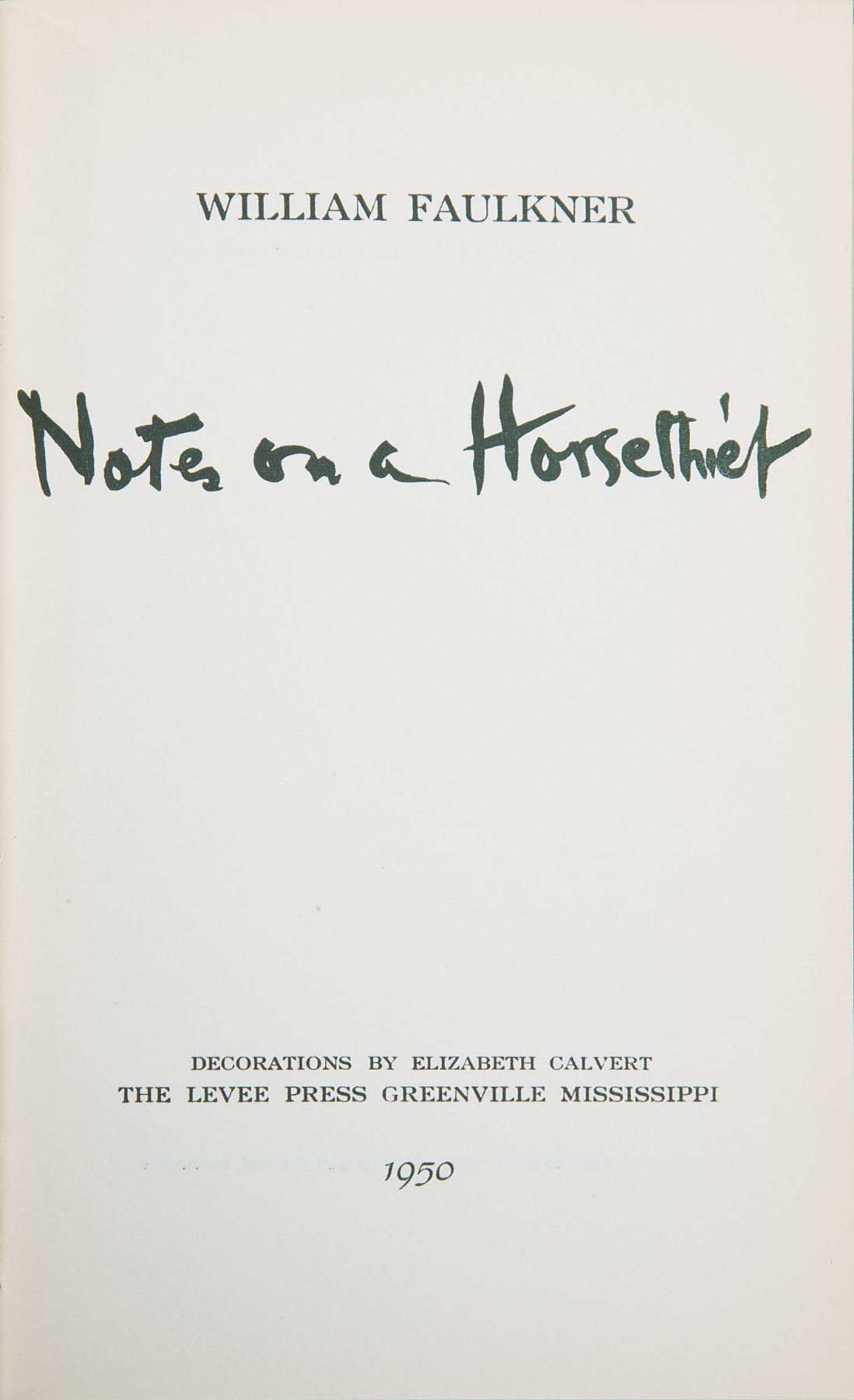 Signed book: Notes on a Horsethief. First edition, limited issue, numbered 764/975. Greenville, MI: The Levee Press, 1950. Hardcover, 6 x 9.5, 71 pages. Signed on the colophon in fountain pen by William Faulkner. Autographic condition: fine. Book condition: VG+/None.