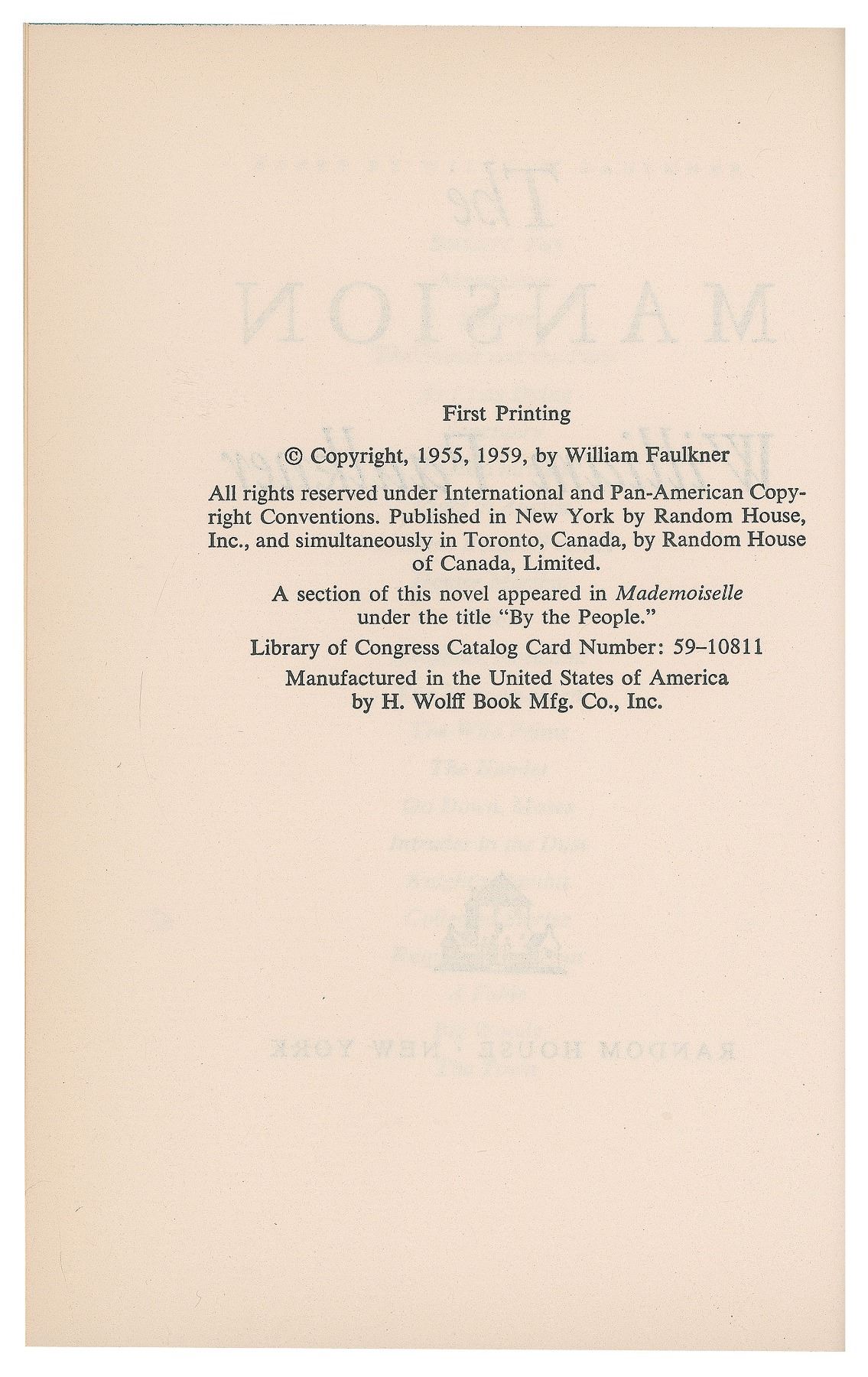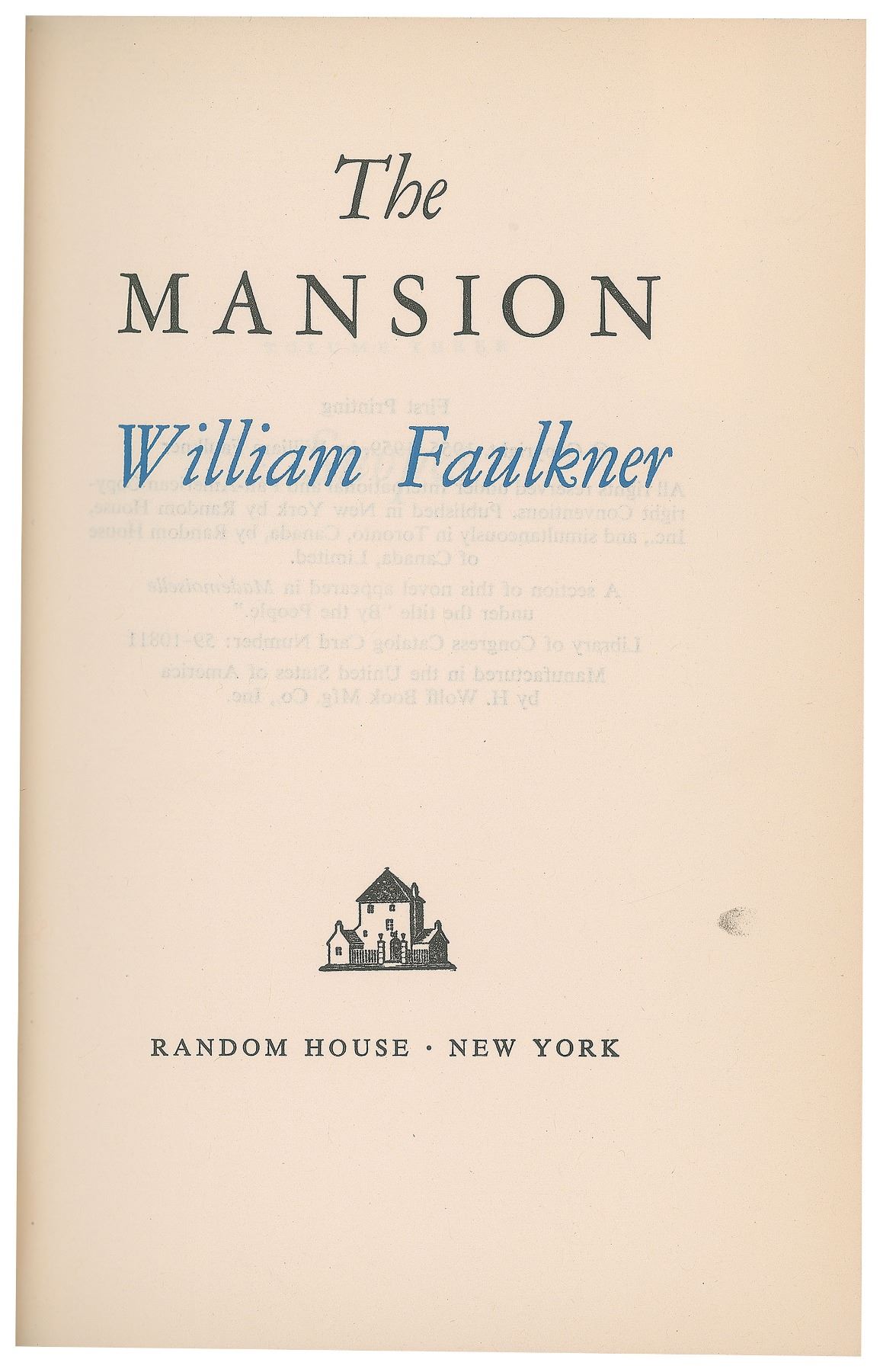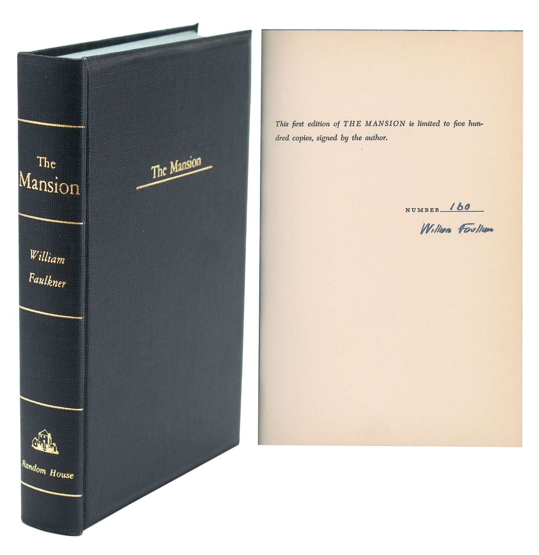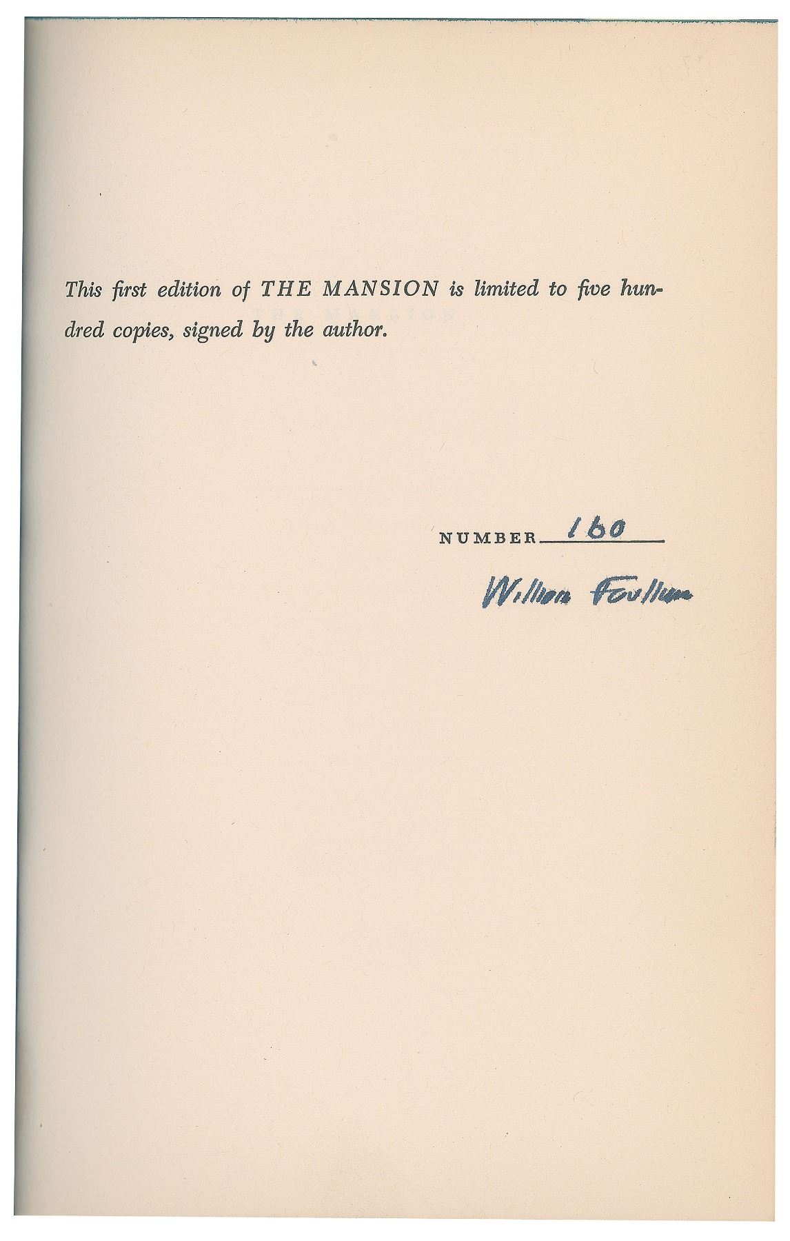 Signed book: The Mansion. First edition, limited issue, numbered 160/500. NY: Random House, 1959. Hardcover, 5.75 x 8.25, 436 pages. Signed on the colophon in fountain pen, "William Faulkner." Autographic condition: fine. Book condition: NF/None, with a trivial smudge to the title page. The last installment of Faulkner's 'Snopes' trilogy, the novel traces the downfall of the Snopes family of Jefferson, Mississippi.