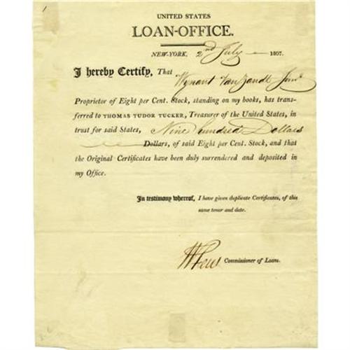 <B>William Few Partly Printed Document Signed</B></I> "<I>W Few</B></I>" as Commissioner of Loans, one page, 7.75" x 9.5". New York, July 2, 1807. In full, "<I>I hereby certify That Wynant Van Zandt Junr Proprietor of Eight per Cent Stock, standing on my books, has transferred to Thomas Tudor Tucker, Treasurer of the United States, in trust for said States, Nine hundred Dollars, of said Eight per Cent Stock, and that the Original Certificates have been duly surrendered and deposited in my Office.</B></I>" William Few, a signer of the Constitution, represented Georgia in the Continental Congress (1780-1782, 1786-1788) and in the U.S. Senate (1789-1793). Wynant Van Zandt, Jr. (1767-1831) was a New York City merchant and alderman. He founded the Zion Episcopal Church in Little Neck (now Douglaston), N.Y. Light show-through in blank areas from three mounting remnants on verso. Fine condition.<BR><BR><b>Shipping:</b> Flat Material, Small (<a target="_blank" href="http://www.heritageauctions.com/common/shipping.php">view shipping information</a>)