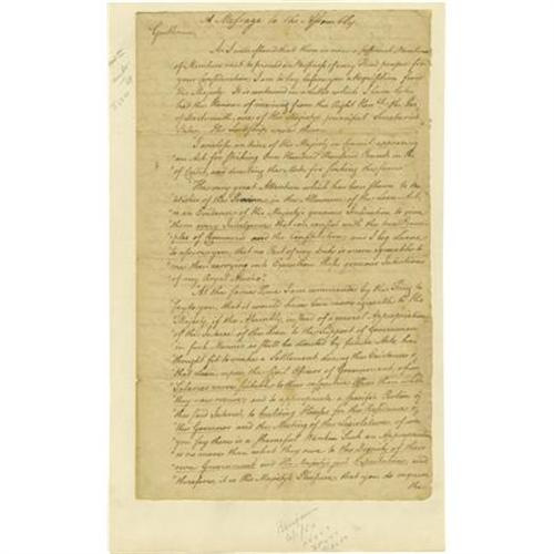 <B>William Franklin Autograph Document Signed As Colonial Governor of New Jersey</B></I> “<I>Wm: Franklin</B></I>”. Two pages, 7.5” x 12.5”, November 21, 1775, with endorsement on verso. William Franklin was the illegitimate son of Benjamin Franklin and the last Colonial Governor of New Jersey. The younger Franklin did not share his father's political views and remained staunchly loyal to the English crown. In this message to the assembly Franklin transmits the details of “<I>an Act for striking One Hundred Thousand Pounds in Bearer of Credit, and directing the Mode of sinking the same</B></I>”. The money, as directed by the King to be used for “<I>Salaries more suitable to their respective Offices than what they now receive…to building Houses for the Residence of the Governor and the Meeting of the Legislature</B></I>”. This document generally spares no chance to flatter the “<I>Royal Master</B></I>”. The document is toned and has evidence of some professional repairs to the right margin, a few areas of cockling, else very good. <I>From the collection of Henry E. Luhrs.</B></I><BR><BR><b>Shipping:</b> Flat Material, Small (<a target="_blank" href="http://www.heritageauctions.com/common/shipping.php">view shipping information</a>)