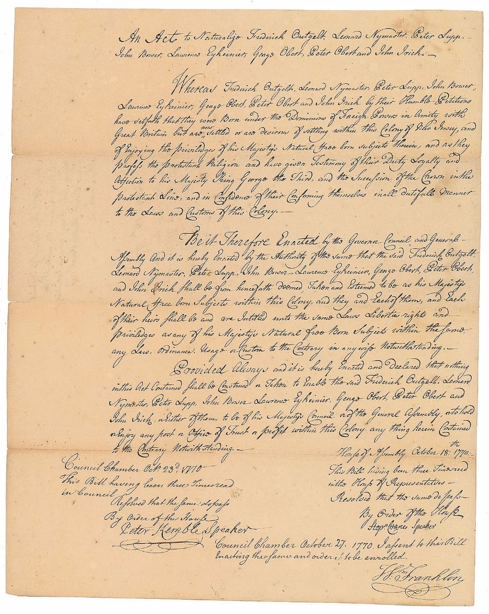 Illegitimate son of Benjamin Franklin (1730–1813) who served as the last colonial governor of New Jersey. Manuscript DS, signed “Wm: Franklin,” one page, 12.25 x 15.5, October 27, 1770. As governor of New Jersey, Franklin approves a bill passed by the state legislature entitled “An Act to Naturalize Frederick Outgelt, Leonard Nymaster, Peter Lupp, John Bower, Lawrence Eykeinier, George Obert, Peter Obert and John Irick.” Signed at the conclusion by Governor Franklin and countersigned by Peter Kemble and Stephen Crane. In fine condition.