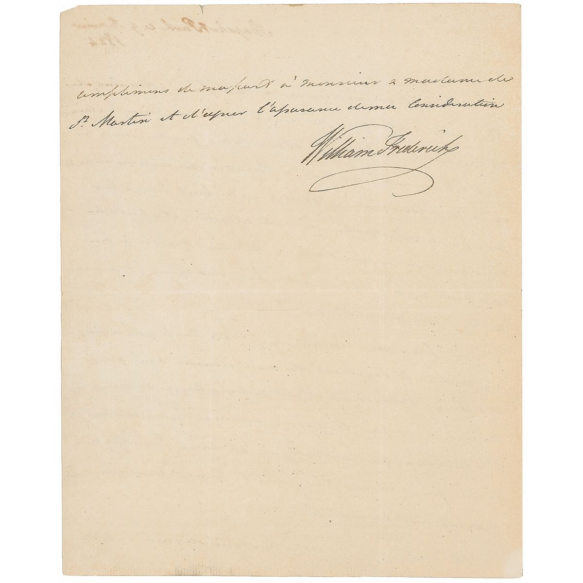 Duke of Gloucester and Edinburgh (1776–1834) who was the great-grandson of King George II. Untranslated LS in French, one page both sides, 8.25 x 10.25, January 9, 1824. In fine condition, with intersecting folds (one vertical fold passing through a single letter of the signature).