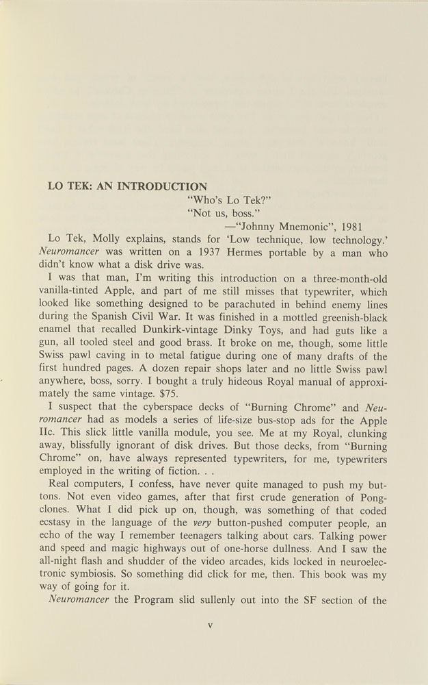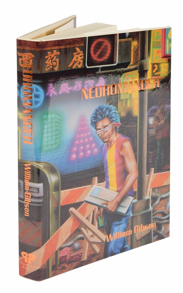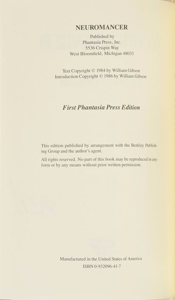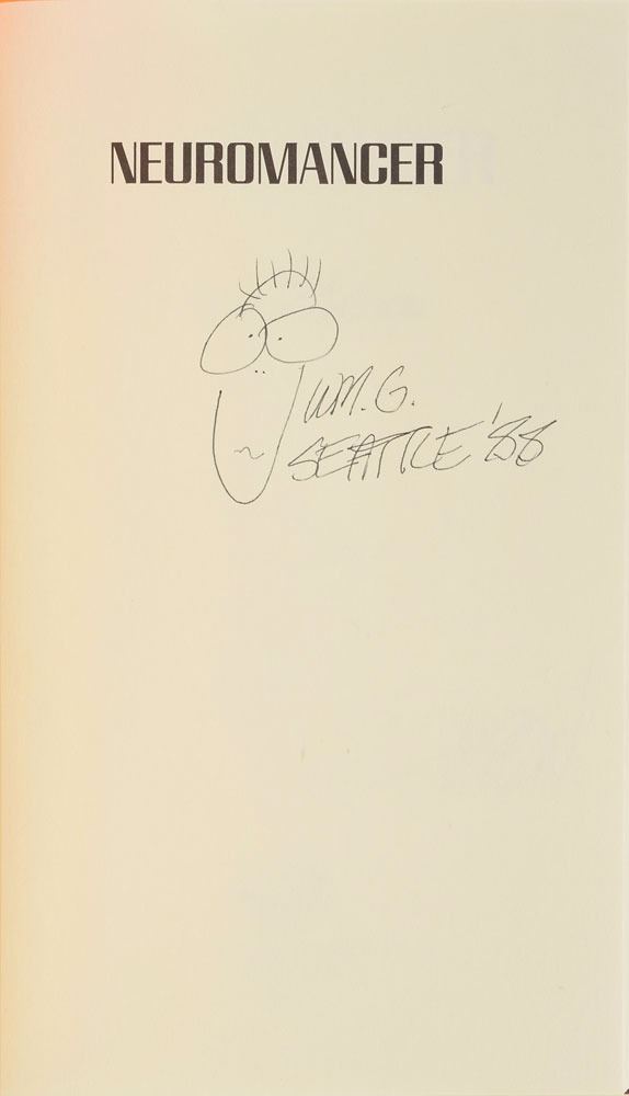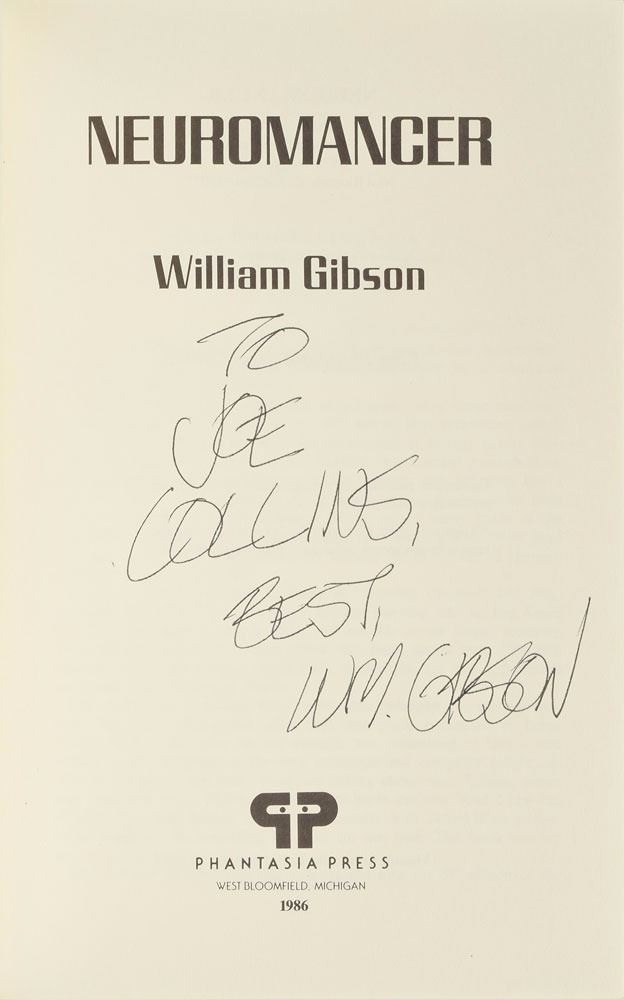 Signed book: Neuromancer. First Phantasia Press edition. West Bloomfield, MI: Phantasia Press, 1986. Hardcover with dust jacket, 6.25 x 9.25, 231 pages. Signed and inscribed on the title page in black ink, "To Joe Collins, Best, Wm. Gibson." Gibson also signed the half-title page, "Wm. G., Seattle '88," and adds a quick self-portrait sketch. In very fine condition. Gibson's debut novel, Neuromancer is a classic of the cyberpunk genre and was the first novel to win the Nebula Award, the Philip K. Dick Award, and the Hugo Award.