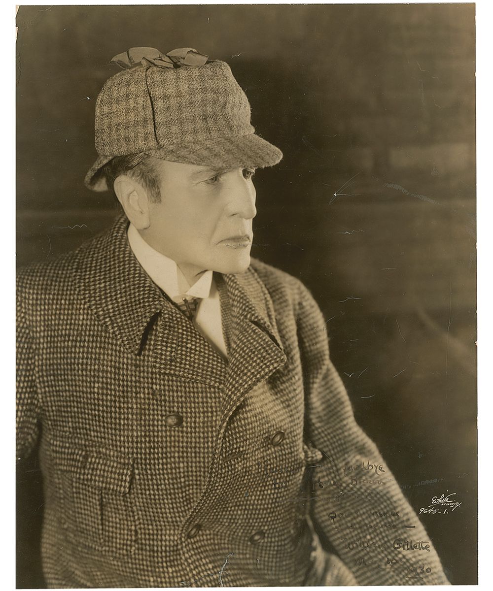 Actor (1853–1937) best remembered today for portraying Sherlock Holmes on stage and in a 1916 silent film. His portrayal of Holmes helped create the modern image of the detective. Very rare vintage glossy 10 x 13 photo of Gillette as Sherlock Holmes, signed and inscribed in fountain pen “Hello and goodbye to Harry Brown—with all good wishes and regards—William Gillette, May 10, 1930.” Photo is affixed to an identical size board. Scattered creases to image and background, trimmed edges, and moderate to heavy contrast to signature and inscription, otherwise very good condition. The first photo of Gillette we have seen in character.