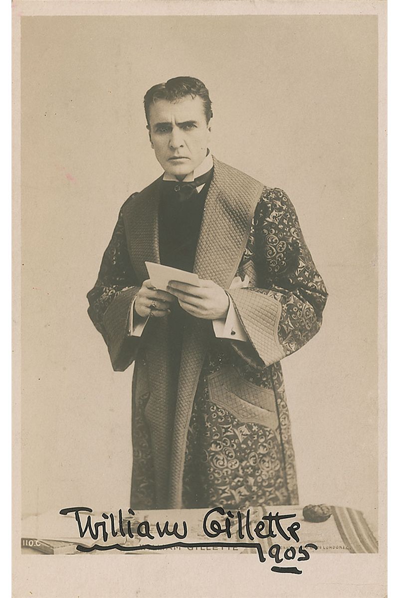Actor (1853–1937) best remembered today for portraying Sherlock Holmes on stage and in a 1916 silent film. His portrayal of Holmes helped create the modern image of the detective. Matte-finish 3.5 x 5.5 postcard photo of Gillette in costume as Holmes, signed in thick black ink, “William Gillette, 1905.” In fine condition.