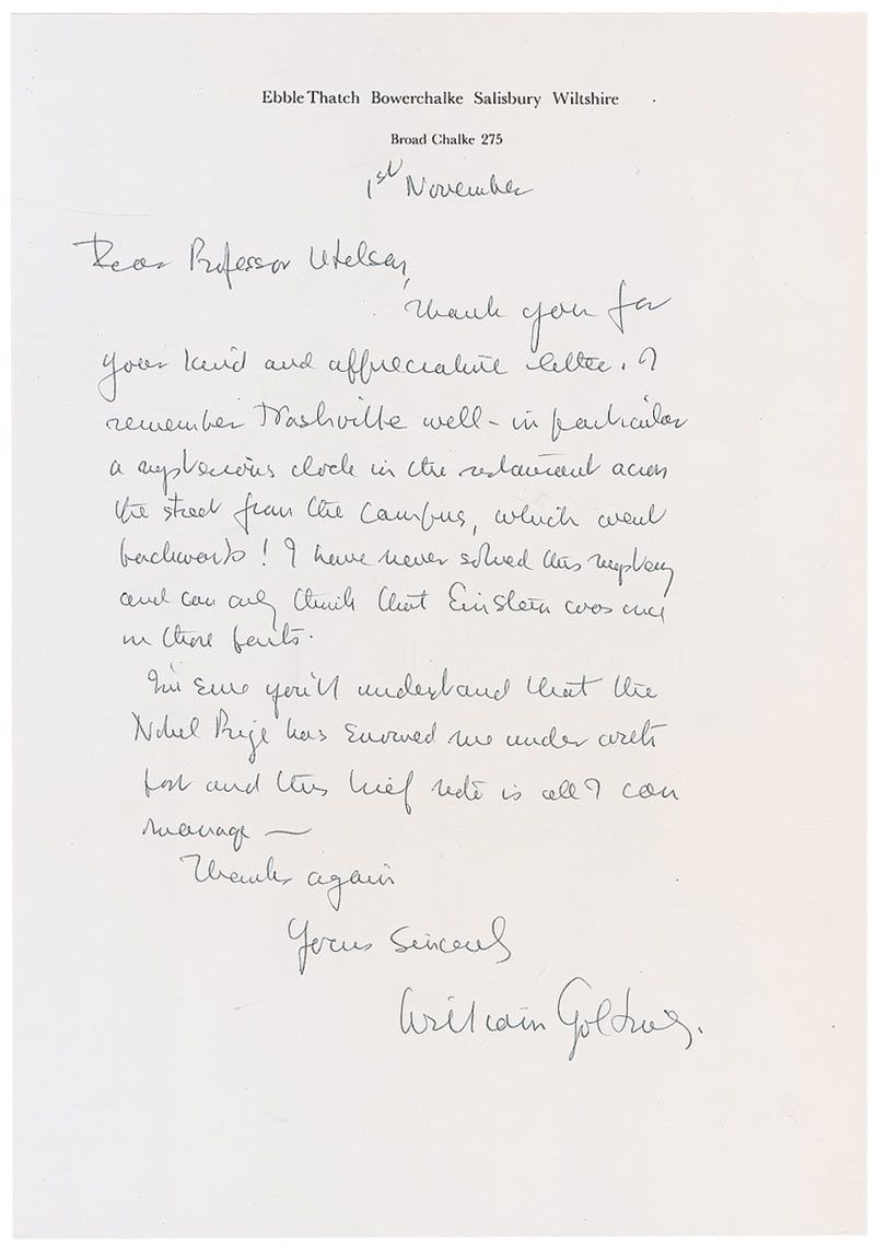 ALS, one page, 8.25 x 11.5, Ebble Thatch, Bowerchalke, Salisbury, Wiltshire, Board Chalke 275 letterhead, November 1. Golding responds to a letter from Professor Udelsen of Nashville, Tennesee who had written to congratulate him on winning the 1983 Nobel Prize for Literature, in full: “Thank you for your kind and affectionate letter. I remember Nashville well - in particular a mysterious clock in the restaurant across the street from the campus, which went backwards! I have never solved this mystery and can only think that Einstein was once in those parts. I'm sure you'll understand that the Nobel Prize has snowed me under with work and this brief note is all I can manage.” In fine condition. Accompanied by the original mailing envelope, postmarked November 3, 1983, and addressed in Golding’s hand. Golding once lectured at Vanderbilt in 1961, not long after becoming a literary superstar for Lord of the Flies.