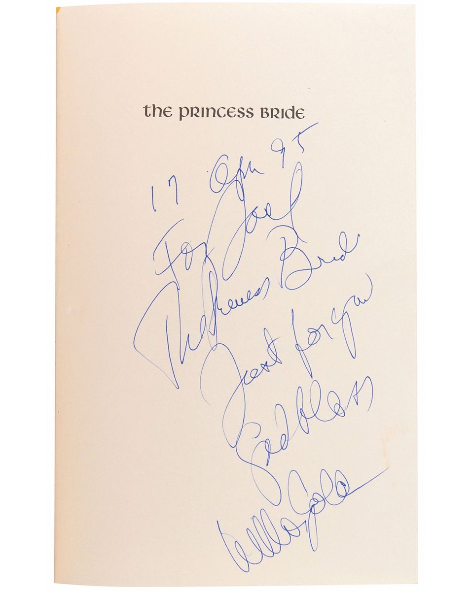 Signed book: The Princess Bride. First edition, first printing. NY: Harcourt Brace Jovanvich, Inc., 1973. Hardcover with dust jacket, 5.75 x 8.5, 308 pages. Signed and inscribed on the half-title page in blue ballpoint, “17 Apr 95, For Joel, The Princess Bride, Just for you. God bless, William Goldman.” In fine condition, with a trivial stain to the extreme edge of the last few pages. A classic book uncommon as a signed first edition.