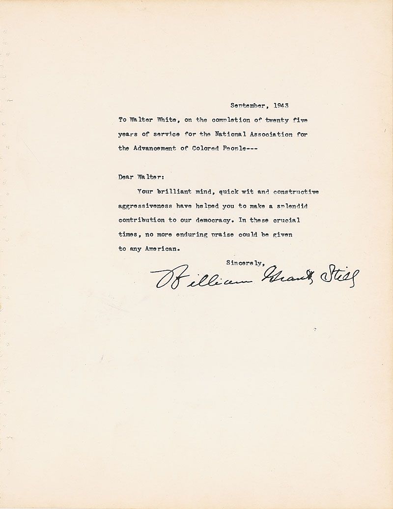 Prominent African-American composer (1895–1978) whose pioneering Afro-American Symphony (1930) was the first work of its kind. Typed tribute letter, signed “William Grant Still,” one page, 8.5 x 11, dated September 1943. Tribute to Walter White commemorating his 25 years of service to the NAACP. In full: “To Walter White, on the completion of twenty five years of service for the National Association for the Advancement of Colored People—Dear Walter, Your brilliant mind, quick wit, and constructive aggressiveness have helped you to make a splendid contribution to our democracy. In these crucial times, no more enduring praise could be given to any American.” In fine condition, with marginal binding holes along left edge. White was a civil rights activist who led the National Association for the Advancement of Colored People (NAACP) for almost a quarter of a century and directed a broad program of legal challenges to segregation and disfranchisement. Having both African and European ancestry, he and his family identified as Negro and lived among Atlanta's Negro community.