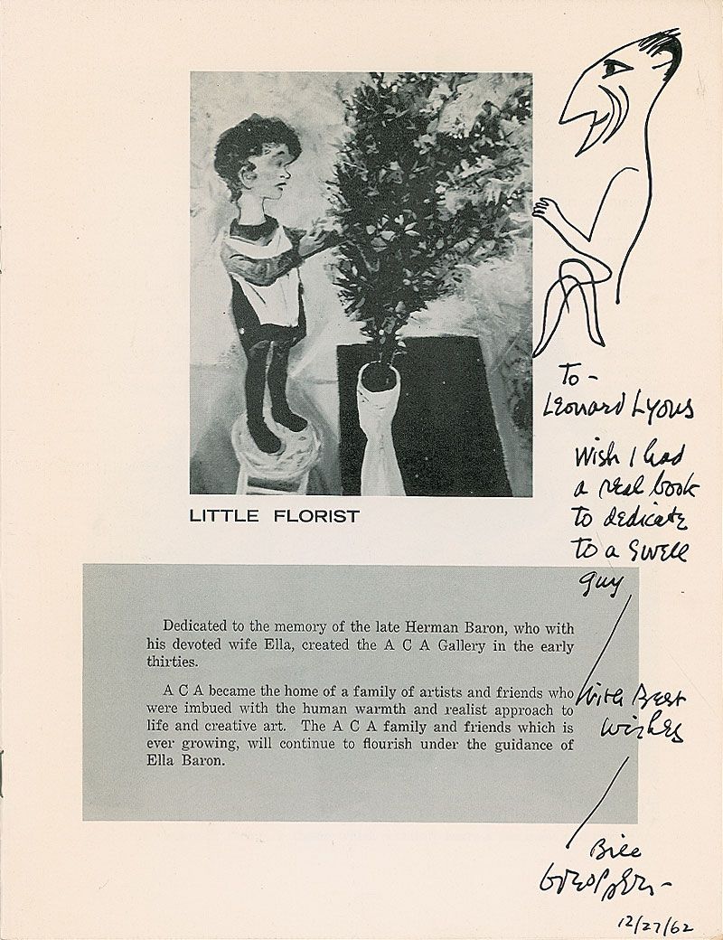 Jewish-American painter and cartoonist (1897–1977) known for his radical political views and contributions to left wing publications. Program for a show at A. C. A. Gallery in New York, 8.5 x 11, with a bold original ink sketch of a man on the first page,