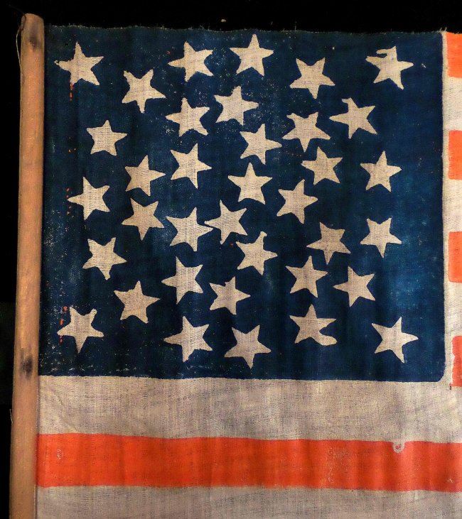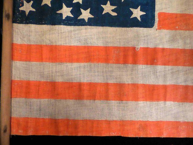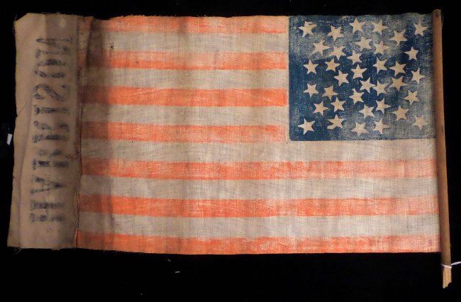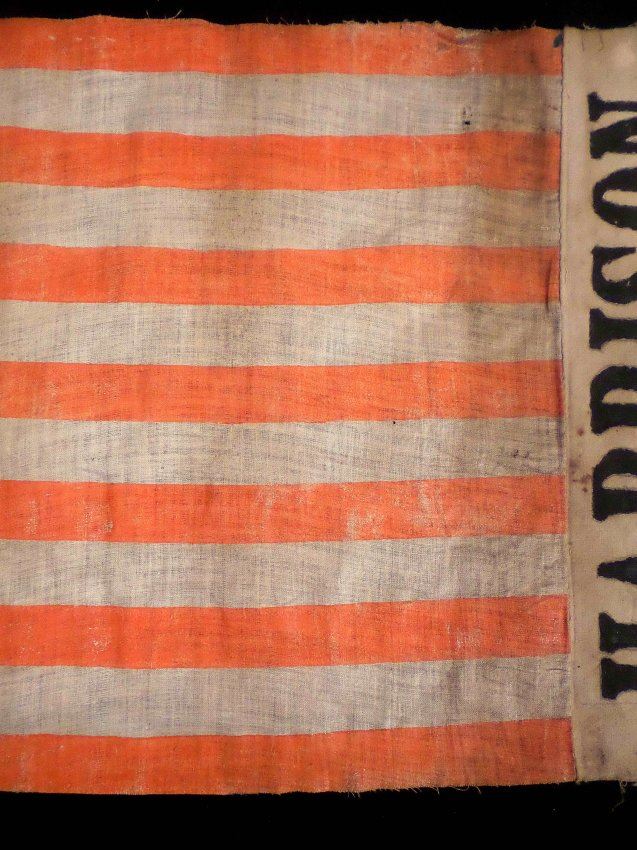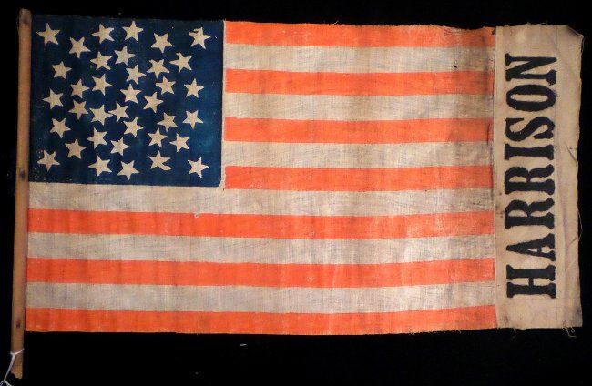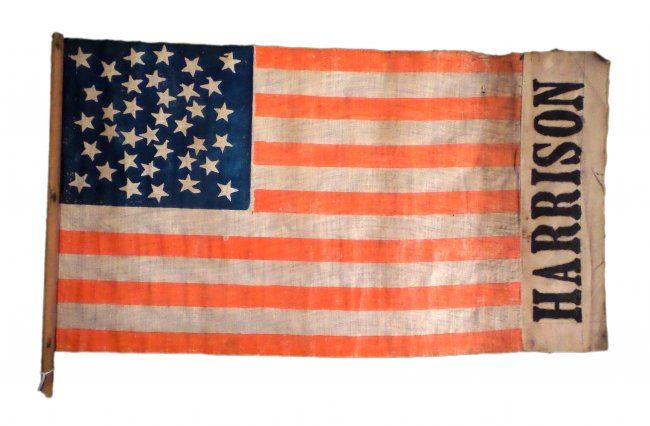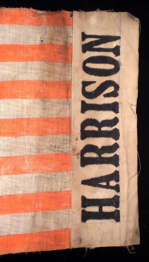 Campaign flag bearing seven red stripes and six white stripes with blue field containing 36 stars. Right edge bears a sewn-affixed linen strip boldly painted "Harrison" vertically. Retains partial original wooden pole. [Overall 13" x 23"]. Soiling, few stains, and wear at edges. Scarce Harrison name flag.