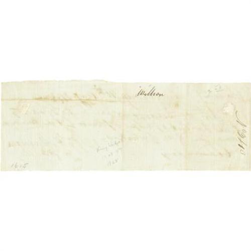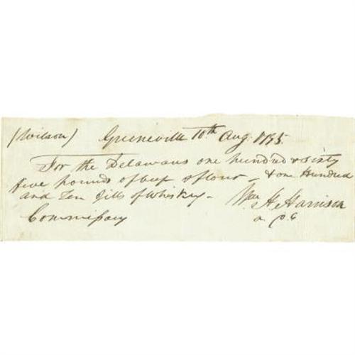 <B>William H. Harrison Autograph Document Signed</B></I> “<I>Wm. H. Harrison/a d c,</B></I>” one page, 7.5” x 2.5”. Greeneville, August 10, 1795. In full, to the Commissary, “<I>For the Delawares one hundred & sixty five pounds of beef & flour - & one Hundred and Ten Gills of Whiskey.” </B></I>In 1794, General “Mad Anthony” Wayne and his army, including his 20-year-old aide-de-camp William H. Harrison, were victorious against a confederacy of Indian tribes in the Battle of Fallen Timbers. The resulting Treaty of Greenville was signed at Fort Greenville on August 3, 1795, just one week before this document was handwritten and signed. Officially, it was “A Treaty of Peace between the United States of America and the Tribes of Indians called the called the Wyandots, Delawares, Shawanoes, Ottawas, Chipewas, Putawatimes, Miamis, Eel-river, Weeas, Kickapoos, Piankashaws, and Kaskaskias.” By the treaty, the United States agreed to deliver to the tribes upon signing “a quantity of goods to the value of twenty thousand dollars…and henceforward every year forever…like useful goods, suited to the circumstances of the Indians of the value of nine thousand five hundred dollars…To the Delawares, the amount of one thousand dollars…” This document represents one of the first deliveries to an Indian tribe, party to the treaty, of useful goods, i.e. beef, flour, and whiskey. Very fine condition. <I>Ex</B></I>. <I>Henry E. Luhrs Collection.</B></I><BR><BR><BR><b>Shipping:</b> Flat Material, Small (<a target="_blank" href="http://www.heritageauctions.com/common/shipping.php">view shipping information</a>)