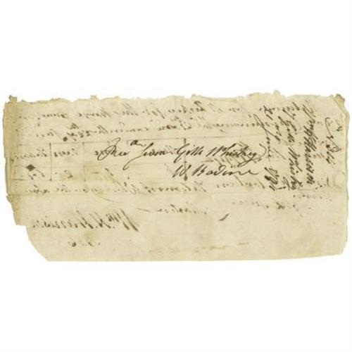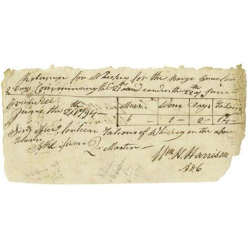 <B>William H. Harrison Autograph Note Signed, "</B></I><I>Wm. H. Harrison A.D.C".</B></I> One page, 8.25" x 4", n.p. , June 21st, 1794. This is a return receipt for whiskey "<I>for the Barge Cruse for 2 Days...</B></I>" Very good condition. <I>Ex. Henry E. Luhrs Collection.</B></I><B><BR></B></I><BR><BR><b>Shipping:</b> Flat Material, Small (<a target="_blank" href="http://www.heritageauctions.com/common/shipping.php">view shipping information</a>)