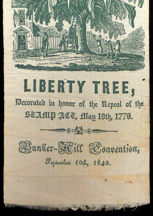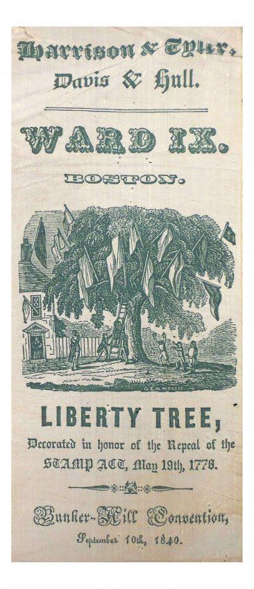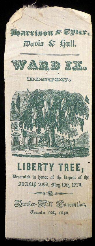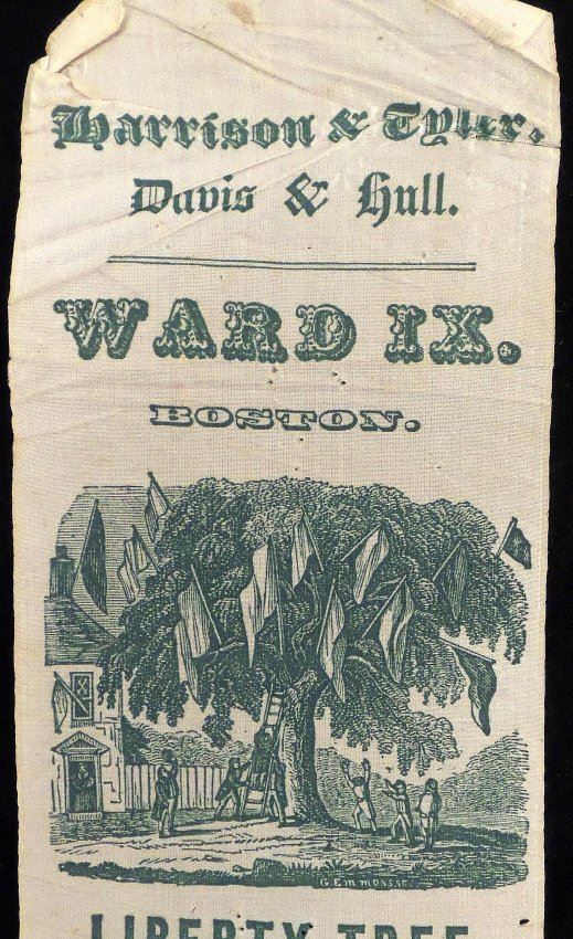 Green printed silk pictorial ribbon issued to the "Bunker Hill Convention / September 10, 1840" for "Ward IX of Boston." Imprinted "Harrison & Tyler / Davis & Hull." [3" W x 8" H]. Toning, light stains, pin holes, creases, and fraying at extreme top and bottom edges. A bold and crisp impression.