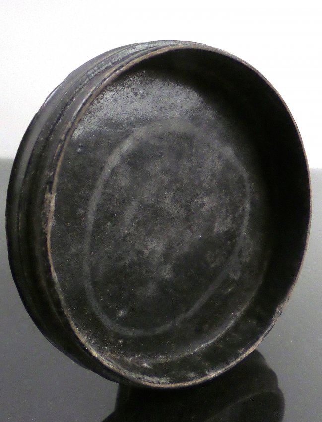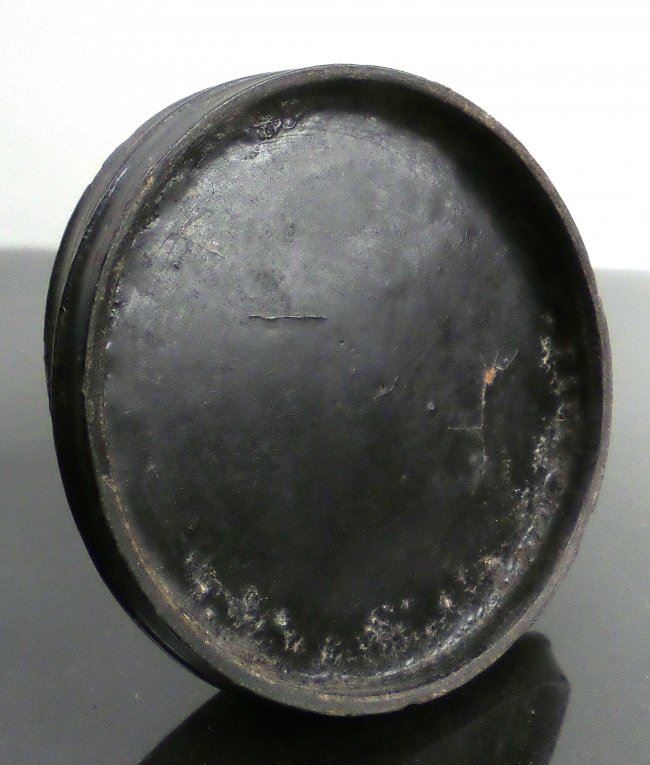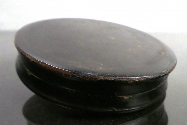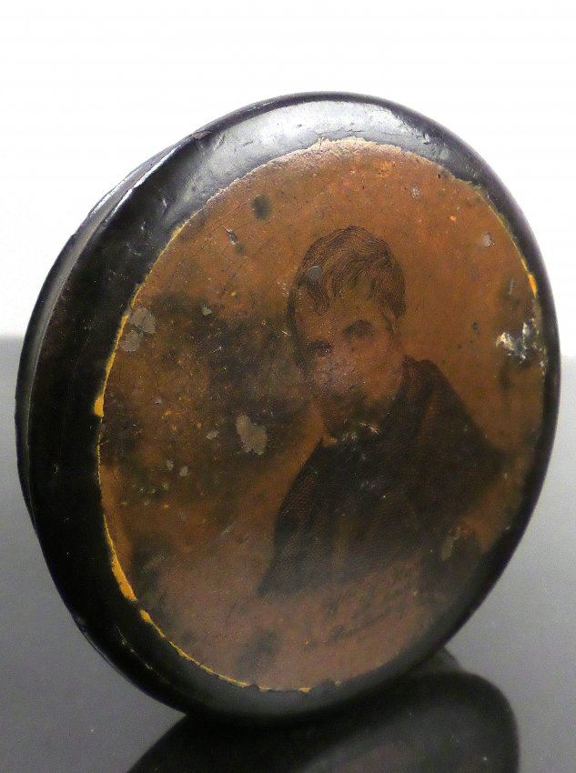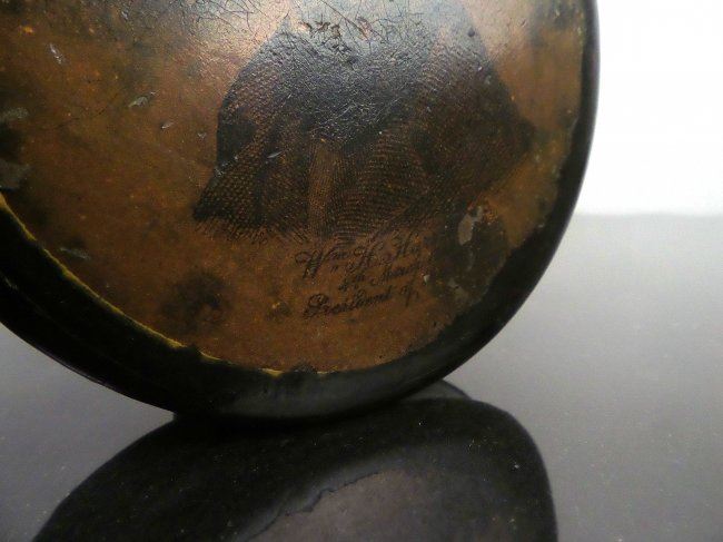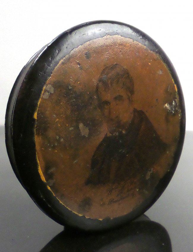 Antique black lacquered snuff box. Lid features a portrait of General Harrison imprinted "Wm. H. Harrison 4th March 1841 President of the U.S." [3 1/4" Dia. x 5/8" H]. Craquelure and flaking throughout, toning, and age stains affecting text below portrait.