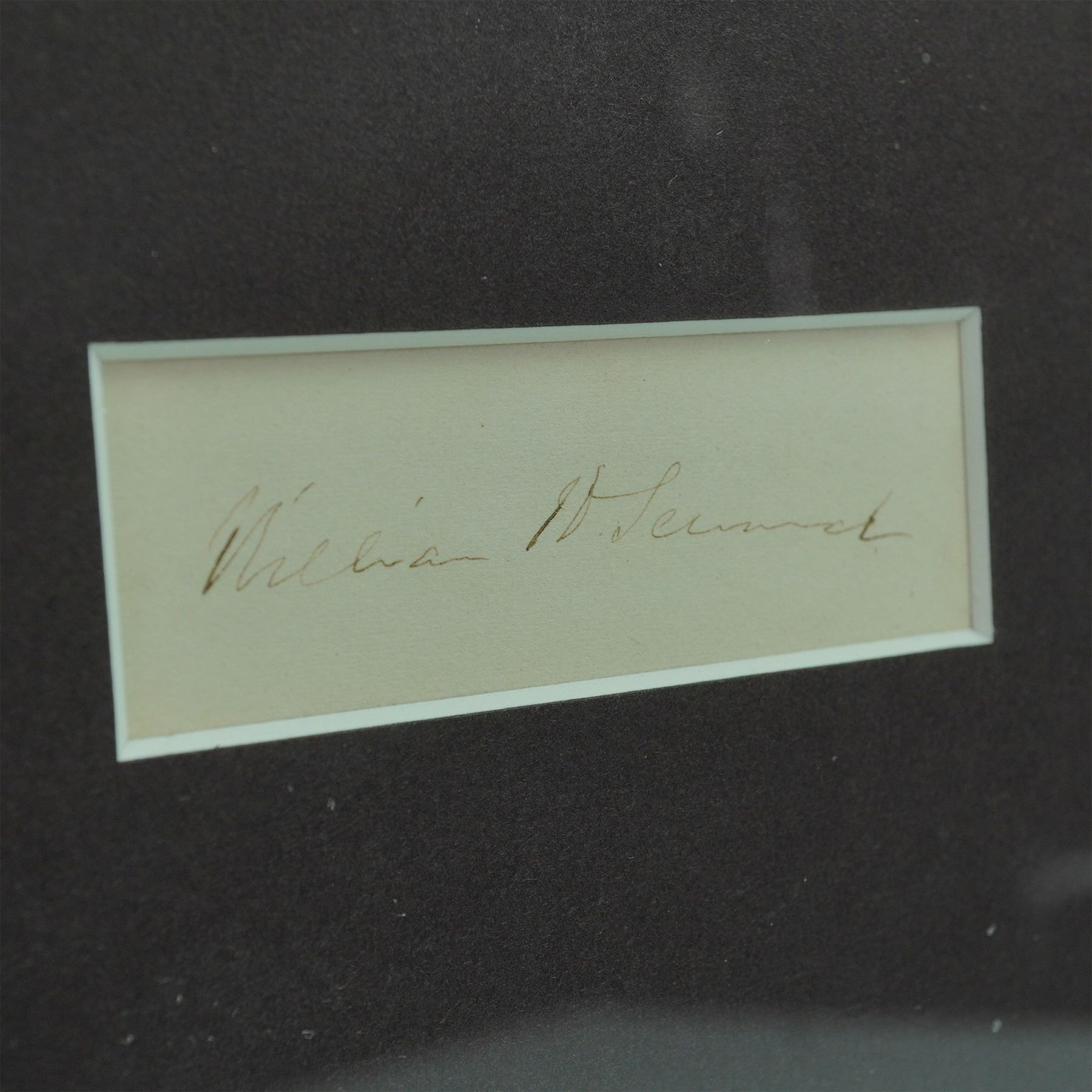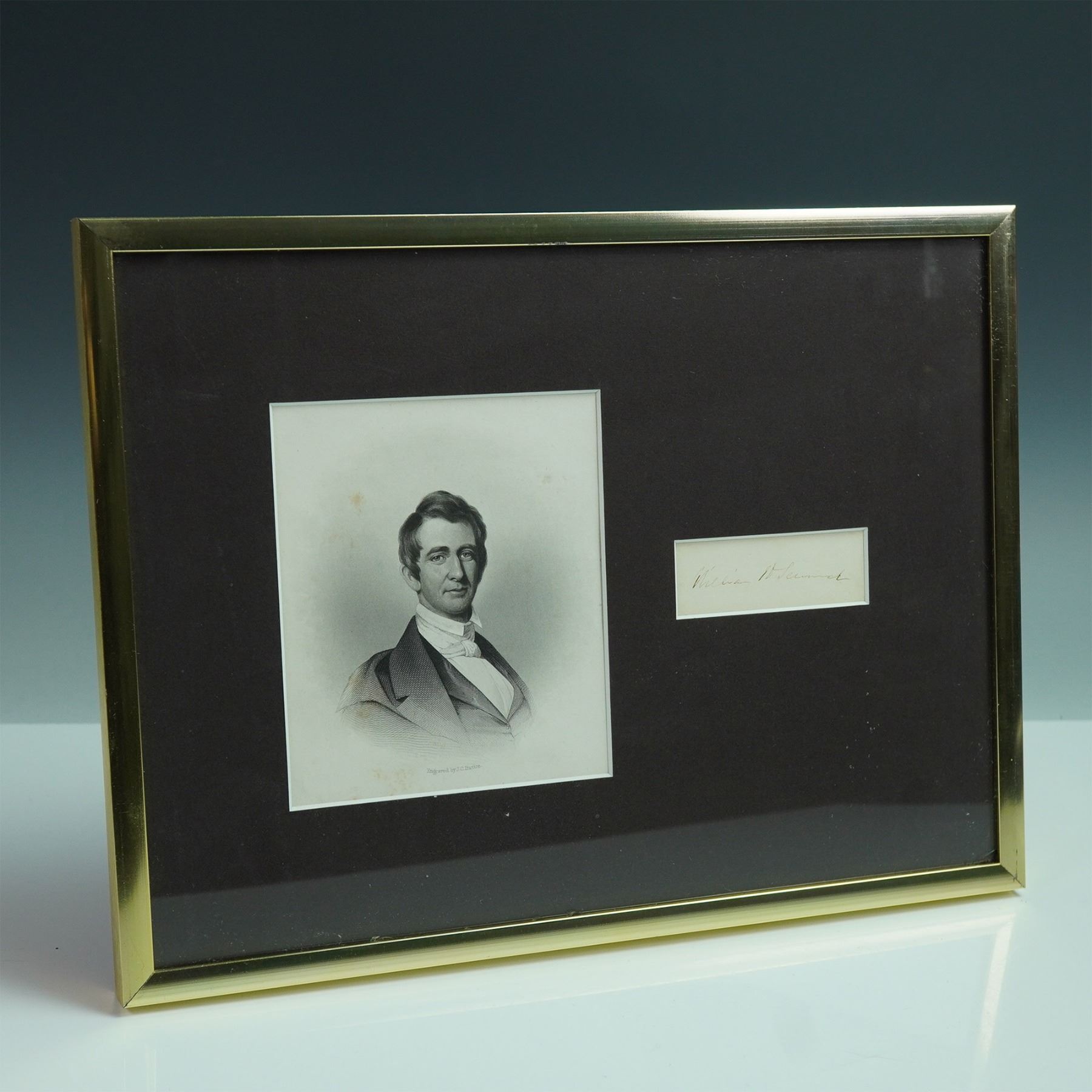 Framed cut signature of William H. Seward, Secretary of State under Lincoln and architect of the Alaska Purchase, paired with an engraved portrait by J.C. Buttre. Presented in black matting with a brass-finish frame.
