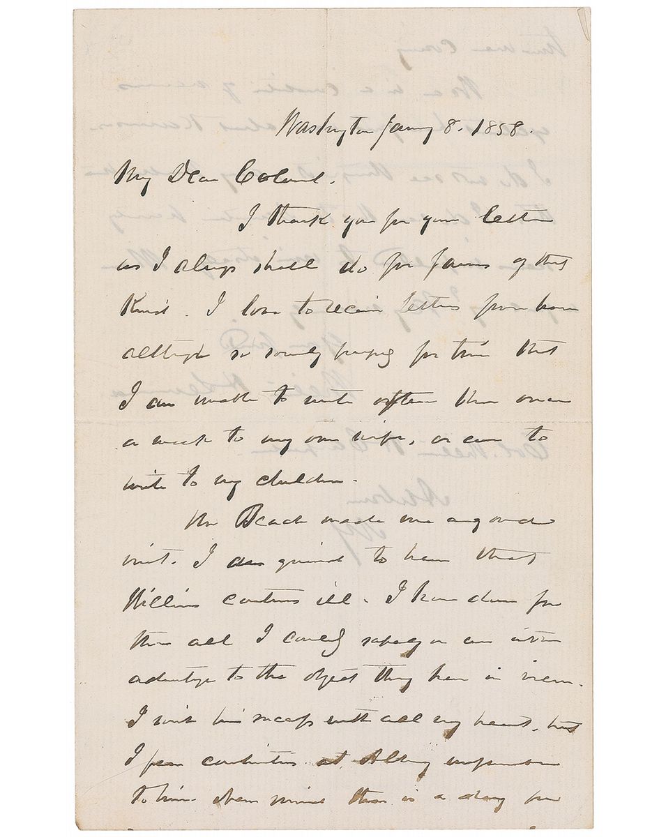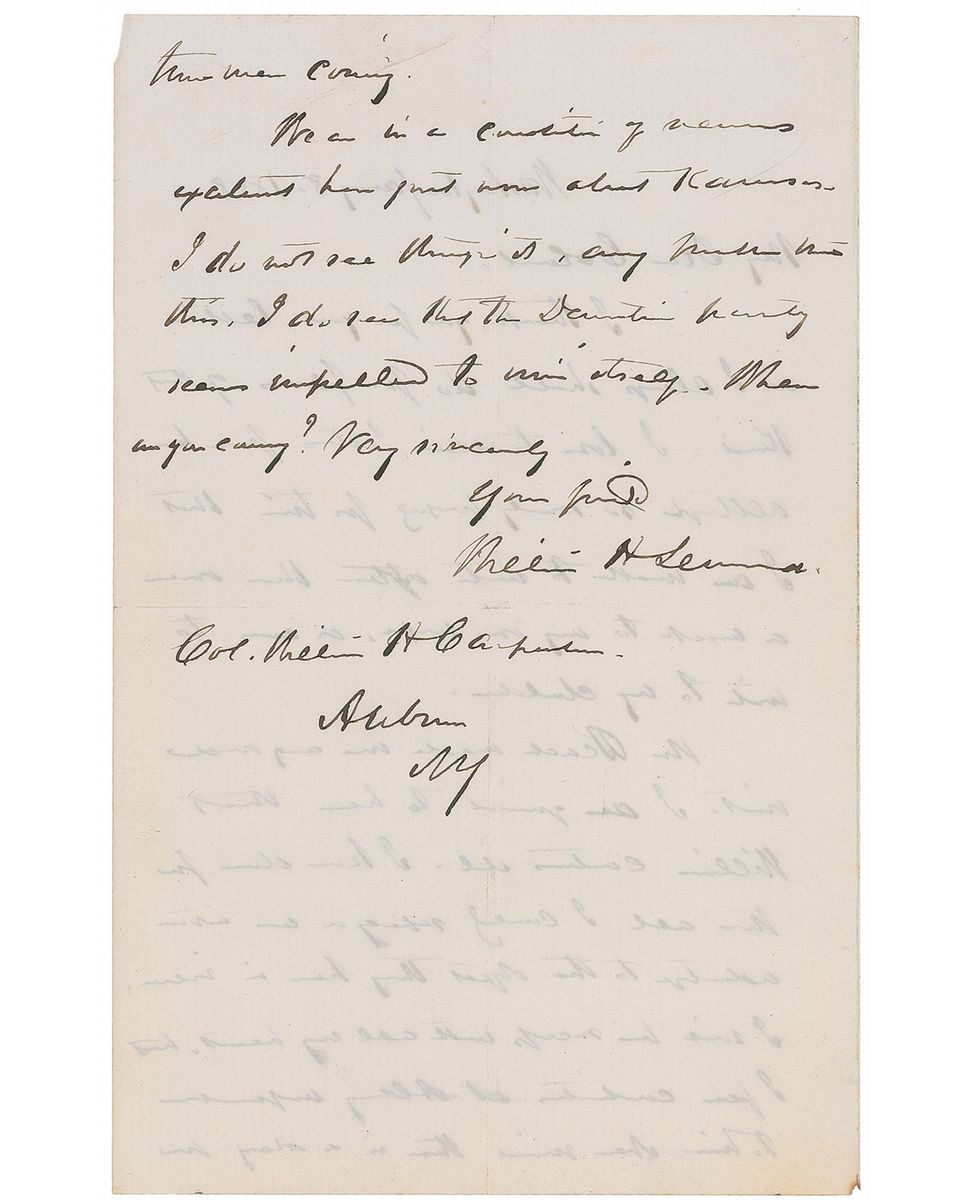 American statesman (1801–1872) who served as secretary of state in the Lincoln administration. ALS, one page, lightly-lined both sides, 5 x 8, January 8, 1858. Letter to a gentleman. In part: “I love to receive letters from home, although so sorely pressed for time that I am unable to write oftener than once a week to my own wife, or even to write to my children…We are in a condition of nervous excitement here just now about Kansas. I do not see through it, any further than this: I do see that the Democratic party seems impelled to ruin itself.” In fine condition, with central vertical and horizontal folds.