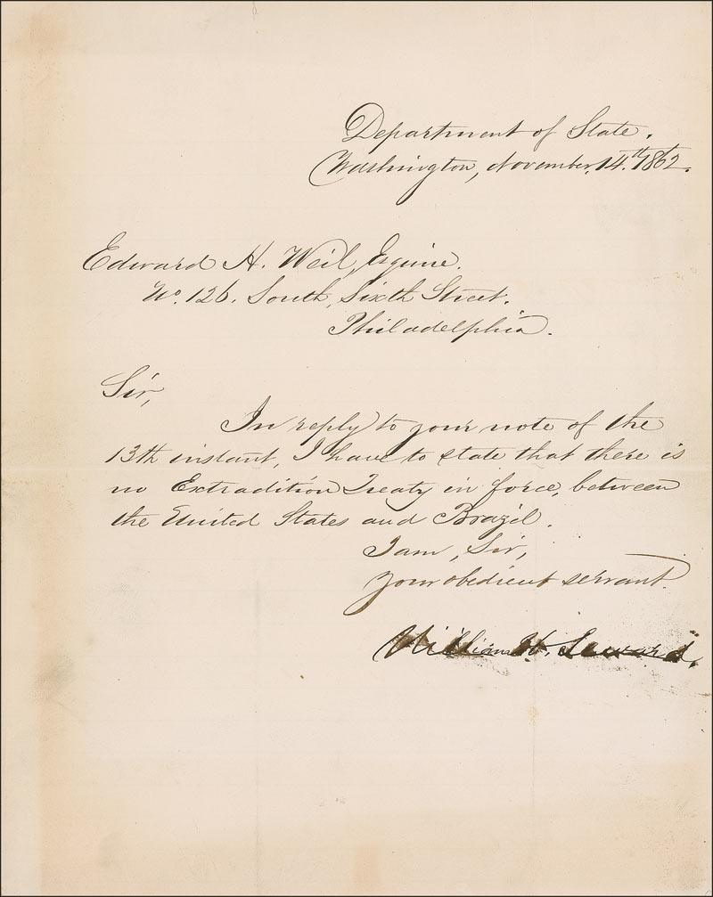 LS, one page, lightly-lined, 7.75 x 9.75, November 14, 1862. Short letter to a gentleman in Philadelphia. In full: “In reply to your note of the 13th instant, I have to state that there is no Extradition Treaty in force between the United States and Brazil.” In very good condition, with moderate brushing to signature, intersecting mailing folds, one through a single letter of signature, and scattered toning. RRAuction COA.