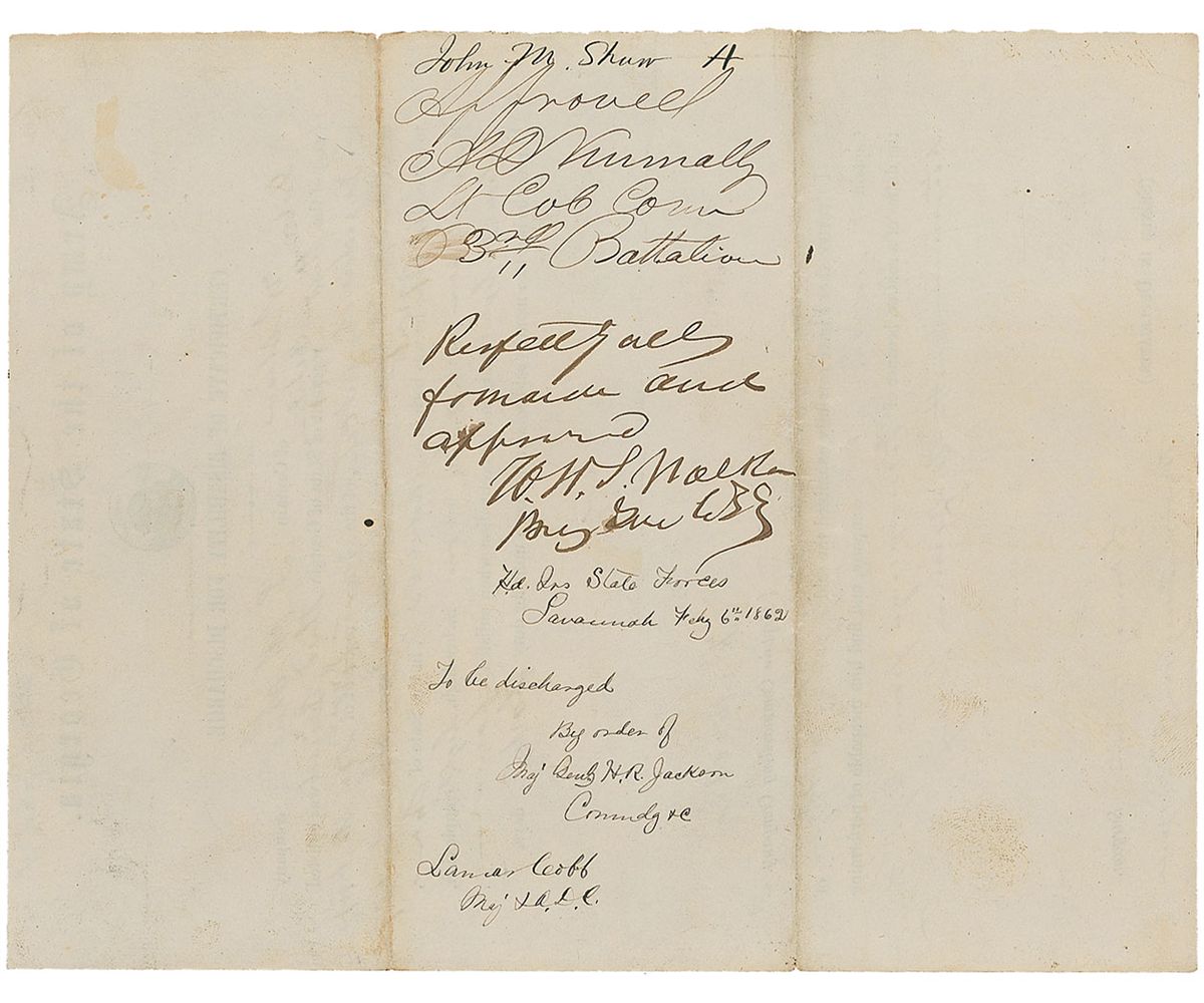 Career United States Army officer (1816–1864) who went on to serve as a Confederate general. He was severely wounded many times in combat, and was killed in action during the 1864 Atlanta Campaign. Civil War–dated handwritten endorsement, “Respectfully forwarded and approved, W. H. T. Walker, Brig. Gen. A. S. G.,” on the reverse of a partly-printed DS, one page, 7.75 x 9.75, February 6, 1864. A certificate of disability for discharge issued to John W. Shaw, as “during the last two months said soldier has been unfit for duty forty days.” In fine condition, with a small edge separation to one fold and expected document wear.