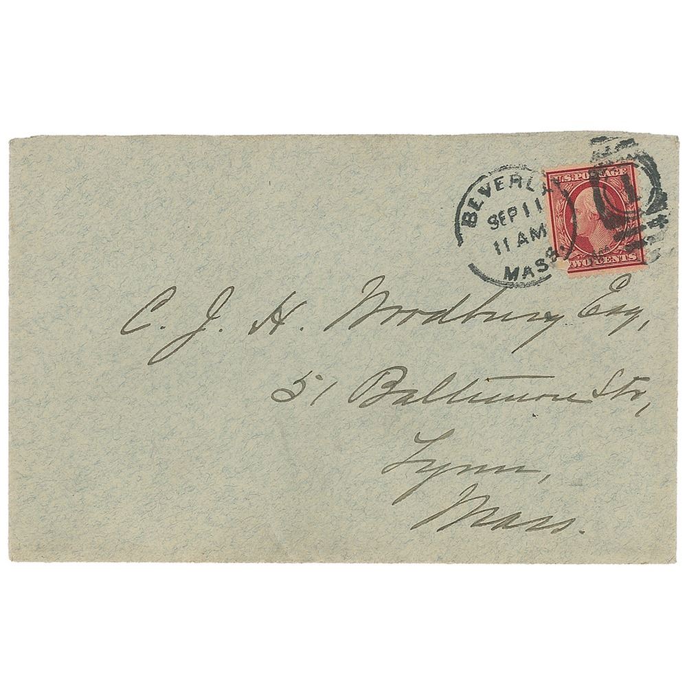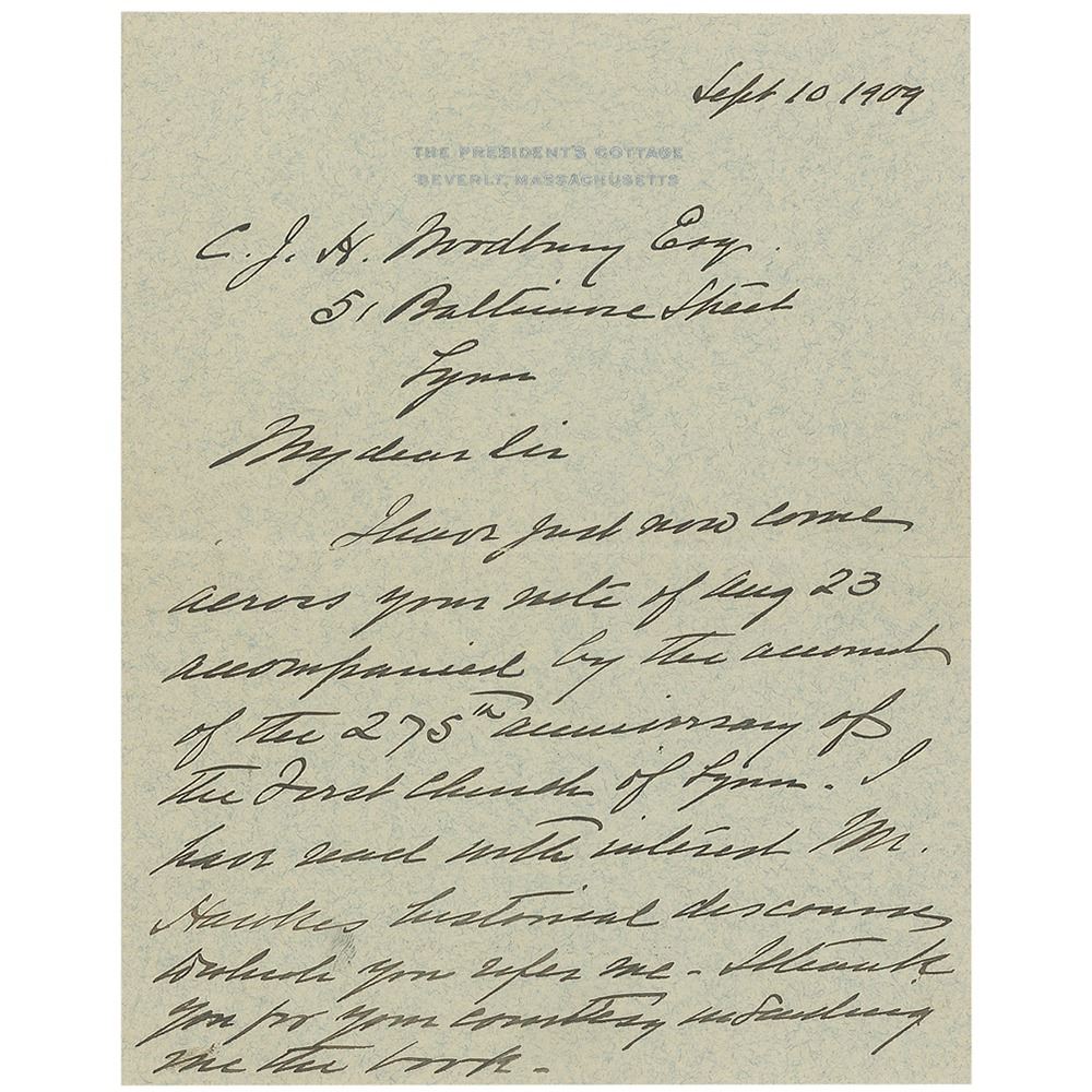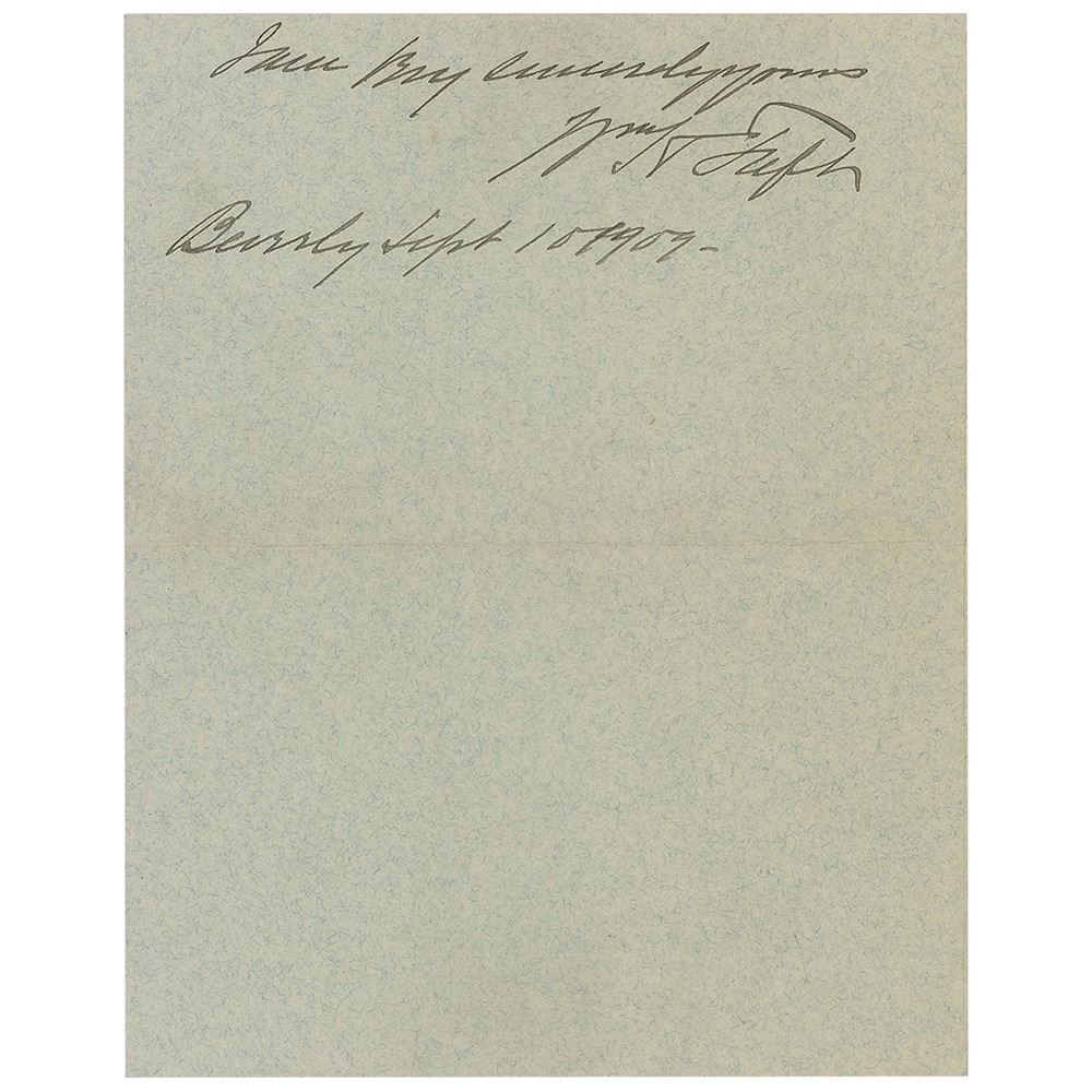 ALS as president signed “Wm. H. Taft,” two pages, 5.5 x 7, The President’s Cottage letterhead, September 10, 1909. Letter to a gentleman, in full: “I have just now come across your note of Aug 23 accompanied by the account of the 275th anniversary of the First Church of Lynn. I have read with interest Mr. Hawkes historical discourses to which you refer me. I thank you for your courtesy in sending me the book.” In fine condition, with a miniscule edge separation to horizontal mailing fold. Accompanied by the original mailing envelope, addressed in Taft’s hand.