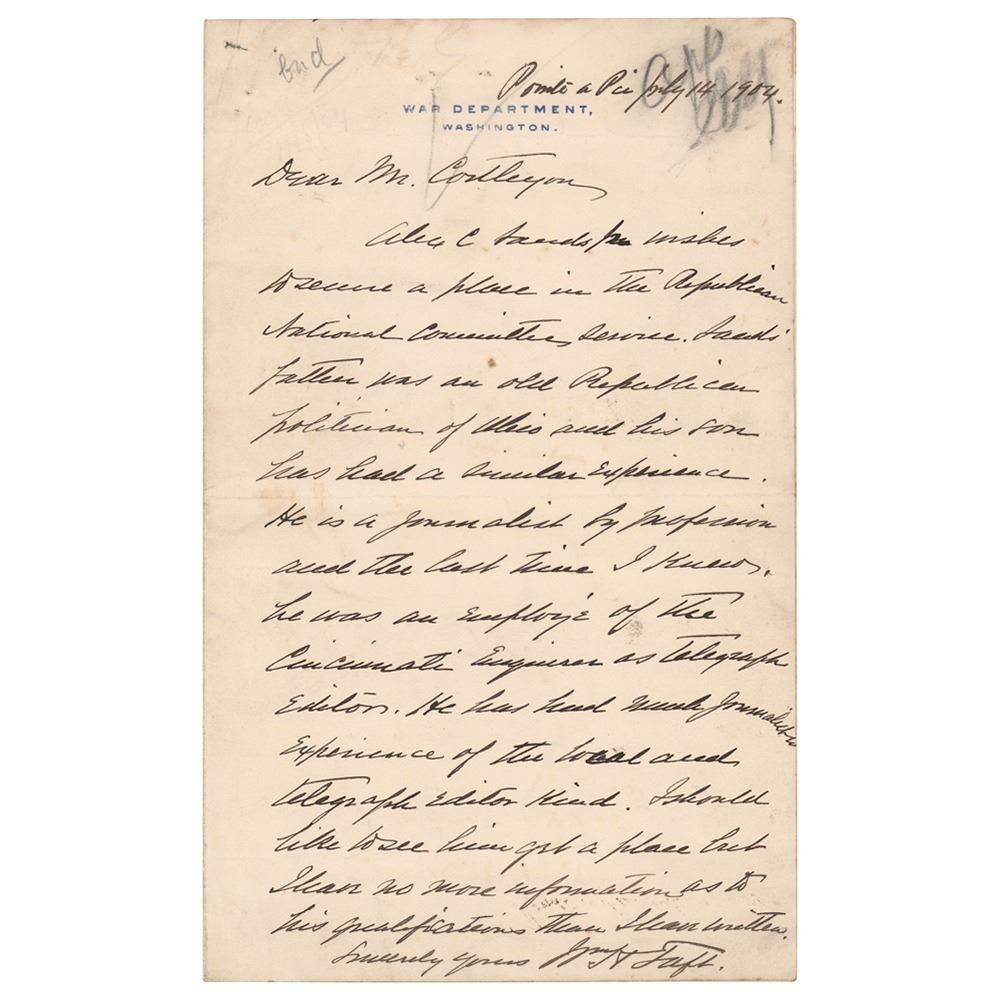 ALS signed ‰ÛÏWm. H. Taft,‰Û one page, 5.5 x 9, War Department letterhead, July 14, 1904. Handwritten letter to George B. Cortelyou, evidently a copy made by Taft and sent to Alex Sands. In part: "Alex C. Sands, Jr. wishes to secure a place in the Republican National Committee's service. Sands' father was an old Republican politician of Ohio and his son has had a similar experience. He is a journalist by profession and the last time I knew, he was an employee of the Cincinnati Enquirer as telegraph editor. He has had much journalistic experience‰Û_I should like to see him get a place but I have no more information as to his qualifications than I have written." In fine condition, with some creasing and pin holes to the top. Taft served as Secretary of War under Theodore Roosevelt from 1904 to 1908; George B. Cortelyou served variously as Secretary of Commerce and Labor, Postmaster General, and Secretary of the Treasury in Roosevelt's administration.