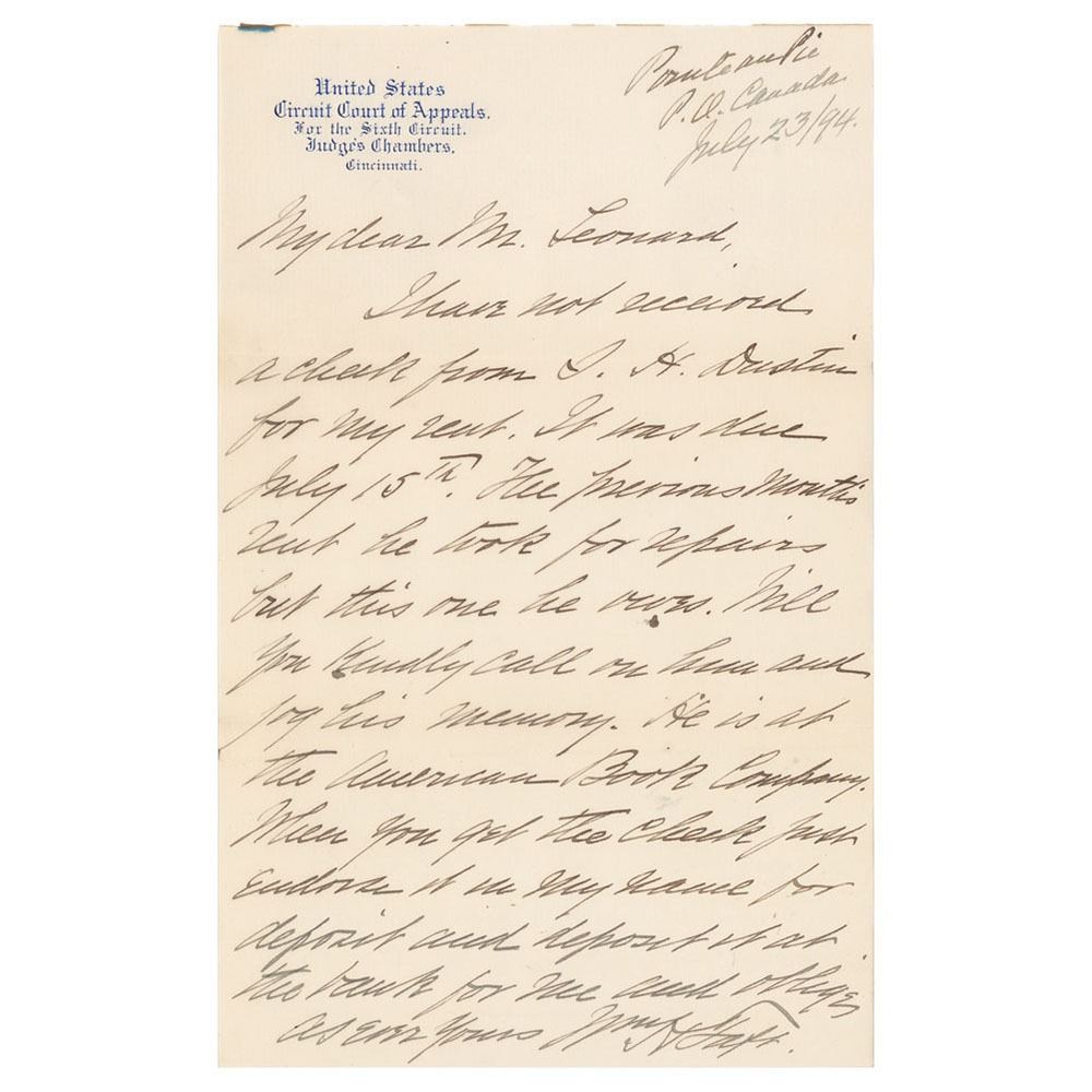 ALS signed “Wm. H. Taft,†one page, 6 x 9.25, United States Circuit Court of Appeals letterhead, July 23, 1894. Handwritten letter from Pointe-au-Pic, Canada, addressed to his longtime associate and private secretary, attorney George Leonard of the Cincinnati Circuit Court of Appeals, in full: "I have not received a check from T. H. Dustin for my rent. It was due July 15th. The previous month's rent he took for repairs but this one he owes. Will you kindly call on him and jog his memory. He is at the American Book Company. When you get the check just endorse it in my name for deposit and deposit it at the bank for me and oblige as ever yours." In fine condition. Accompanied by the original hand-addressed mailing envelope.