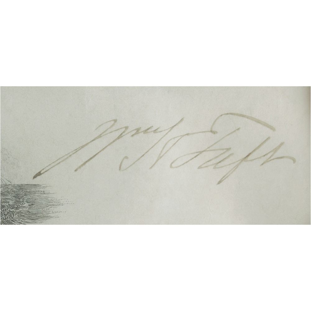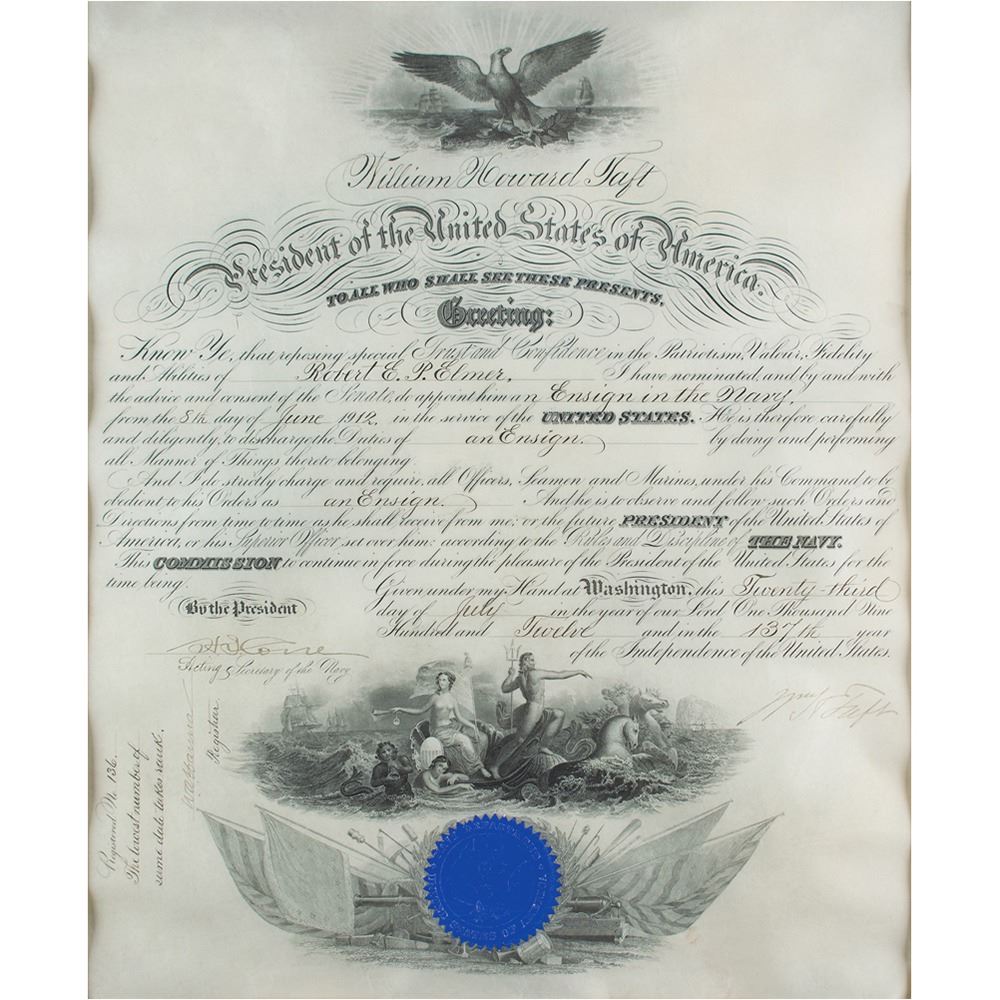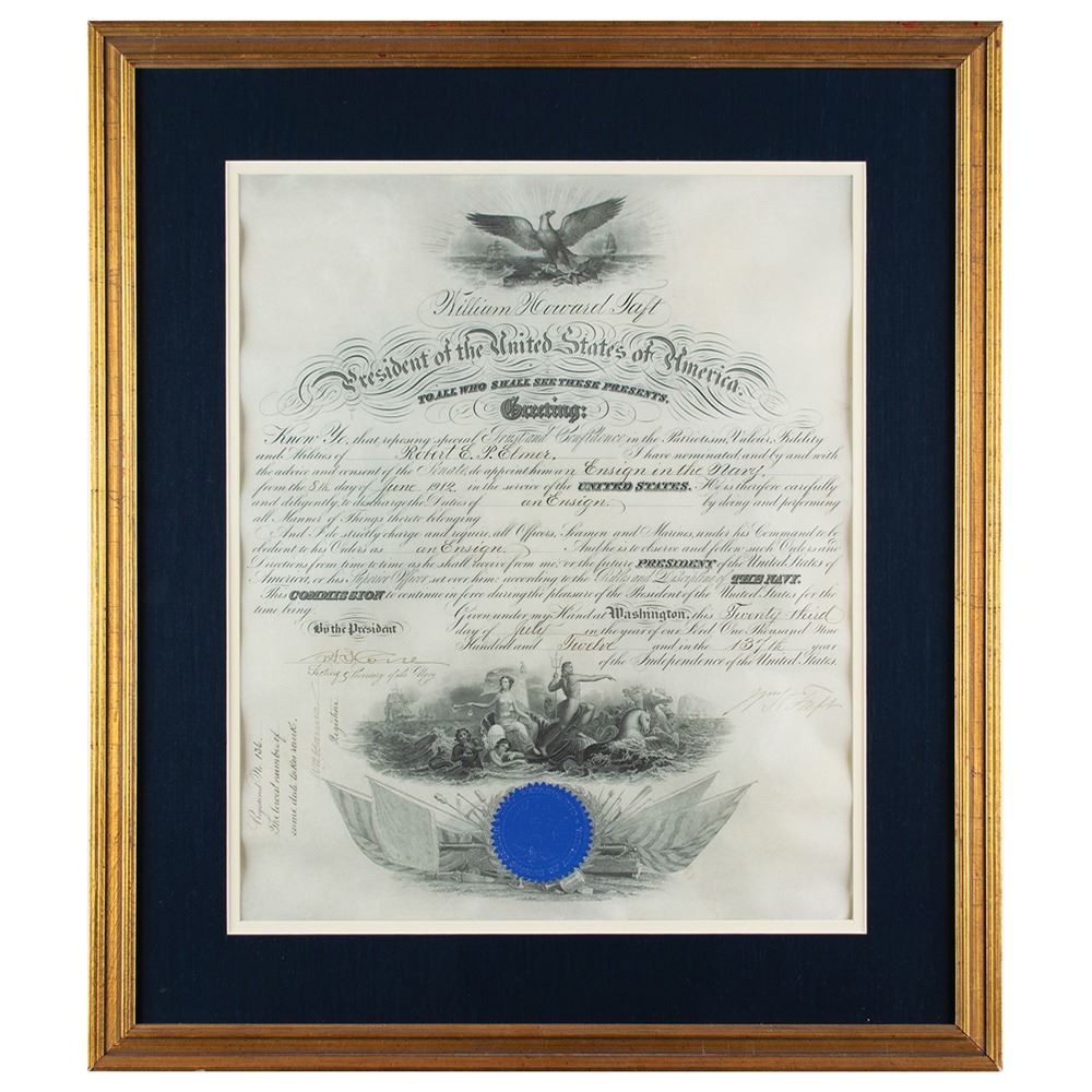 Partly-printed vellum DS as president, signed ‰ÛÏWm. H. Taft,‰Û one page, 13.75 x 17, July 23, 1912. President Taft appoints Robert E. P. Elmer as "an Ensign in the Navy." Signed at the conclusion by President Taft and countersigned by the Acting Secretary of the Navy. The blue Navy Department seal affixed at the bottom remains intact. Professionally double-matted using archival materials and framed under premium UV protected anti-glare glass to an overall size of 20.5 x 23.75. In fine condition, with light overall rippling.