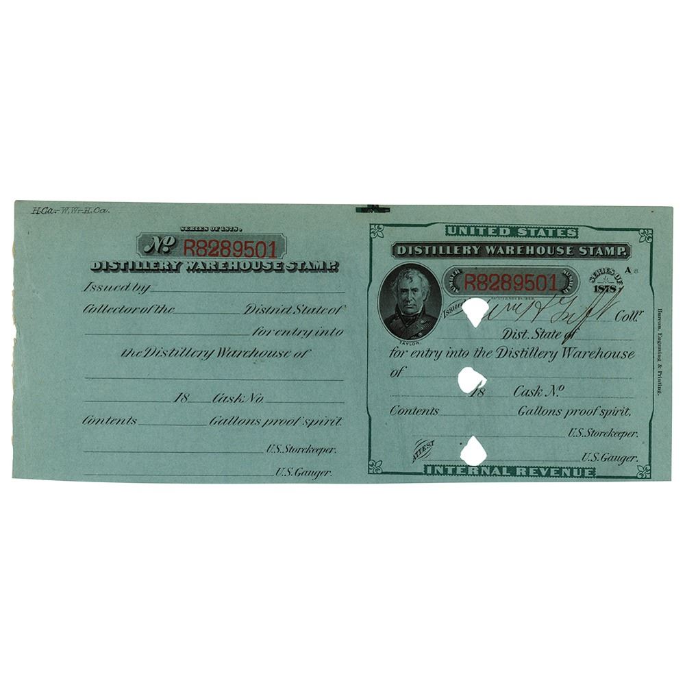 DS, signed "Wm. H. Taft," one page, 7.75 x 3.25, no date ["Series of 1878"]. An unissued Distillery Warehouse Stamp, bearing a portrait vignette of Zachary Taylor, signed by William H. Taft as Collector in Cincinnati. In fine condition, with punch cancellation holes, one affecting middle portion of signature of document.