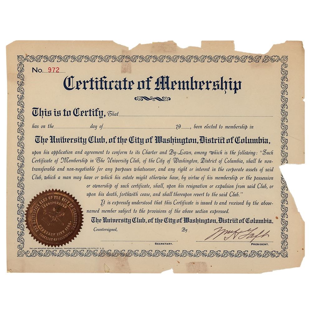 DS, signed “Wm. H. Taft,” one page, 11 x 8.5, no date (circa early 1900s). Unissued certificate of membership into The University Club of Washington, D.C., numbered as "972," and signed neatly at the conclusion by club president William H. Taft. The original gold foil seal remains affixed to the lower left. In very good condition, with tape stains and paper loss to the edges, in no way affecting Taft's bold signature.