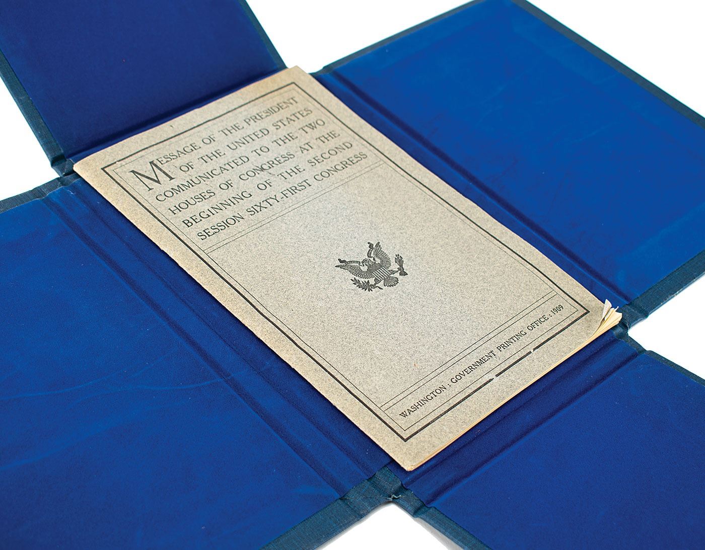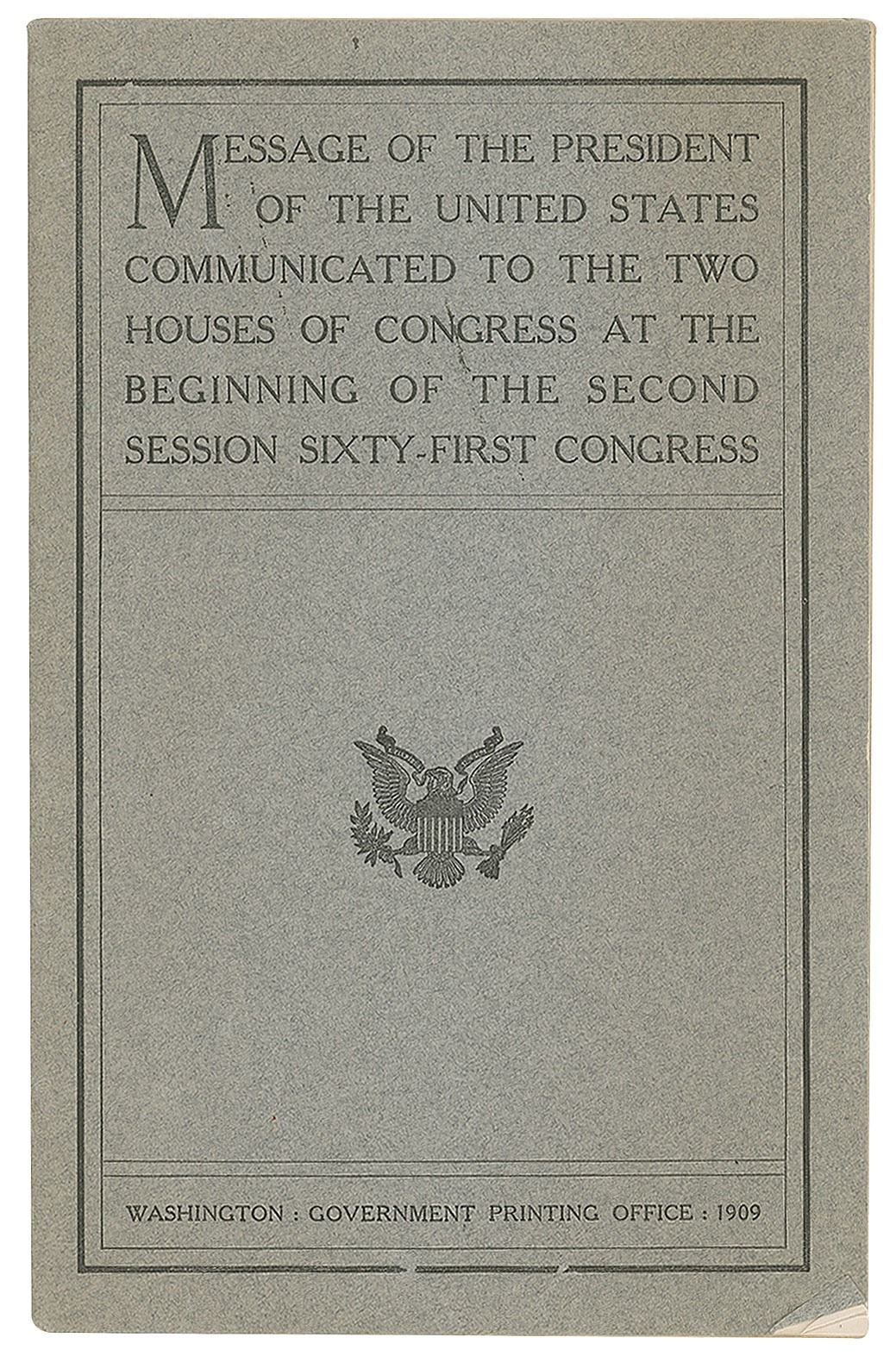 Official booklet entitled "Message of the President of the United States communicated to the two Houses of Congress at the beginning of the Second Session, Sixty-First Congress," delivered on December 7, 1909, published by the Government Printing Office, 5.75 x 9, 40 pages, neatly signed on the last page in bold ink, "Wm. H. Taft." In fine condition, with a paperclip impression to the top edge of the cover and beginning pages of the booklet, slight curling to the lower corner, and a "Library of Lawrence E. Miller" blindstamp to the last page. Accompanied by a custom-made presentation folder with gilt spine titling. Accompanied by a transmittal letter on White House letterhead from Taft's secretary, January 13, 1910, "inclosing herewith a copy of the President's annual message, which he has autographed as you request."