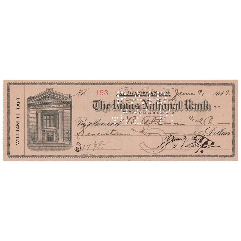 Personal check, 8.25 x 3, filled out in another hand and signed by Taft, "Wm. H. Taft," payable to the luxury department store B. Altman & Co. for $17.65, June 9, 1919. In fine condition. This post-presidency and post-war check dates to not long after his return to Yale University after taking leave to serve as co-chairman of the National War Labor Board.