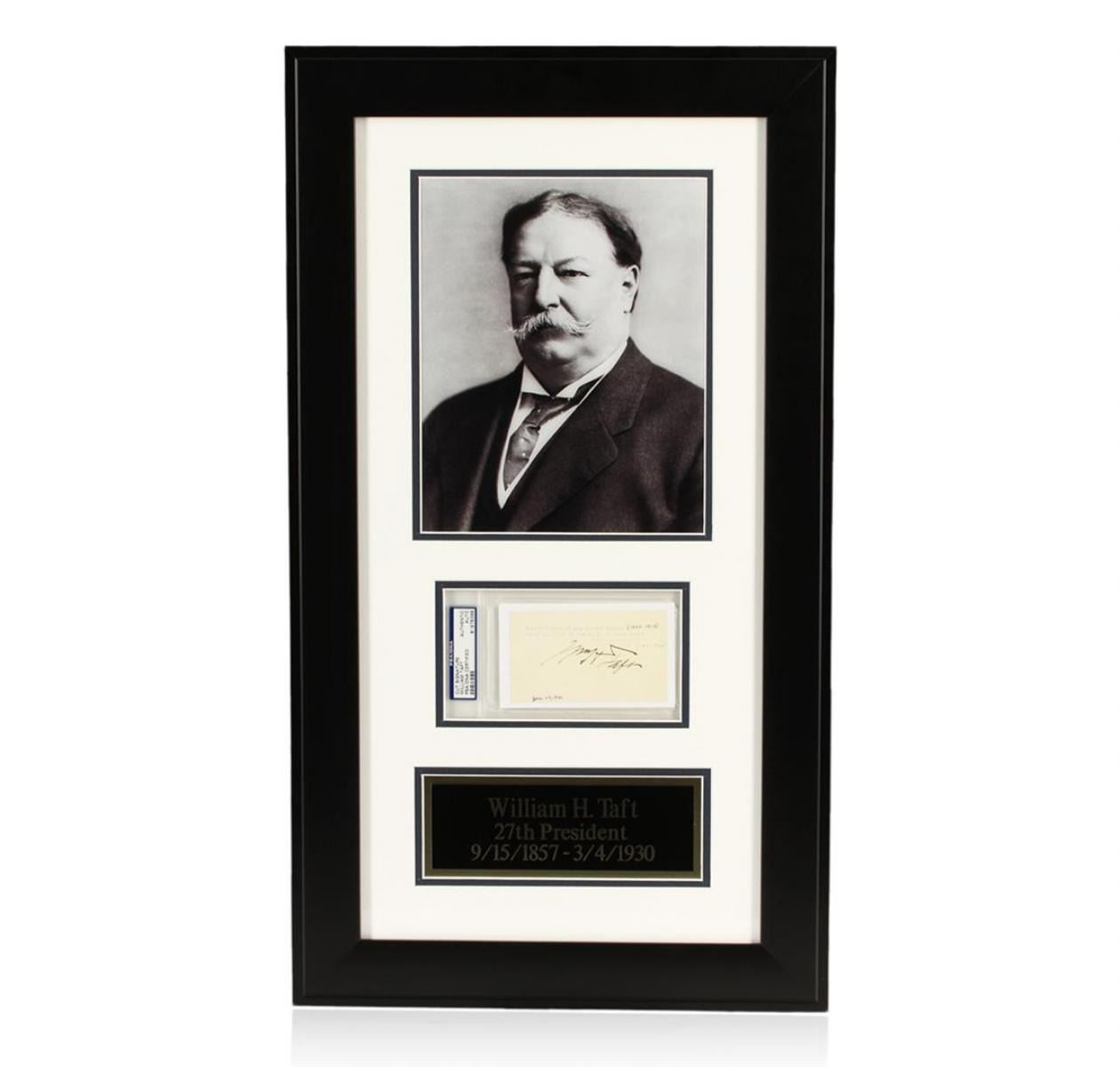 A one of a kind display featuring the autograph of President William H. Taft showcased in a beautiful custom matted display that features a photo of President Taft. The signature is authenticated and encapsulated by PSA. William Howard Taft (September 15, 1857 - March 8, 1930) was an American statesman who served as both the 27th President of the United States (1909 - 1913) and later the 10th Chief Justice of the United States (1921 - 1930). This piece comes framed and ready to hang! Dimensions: 15.5" x 27". PSA Certified.