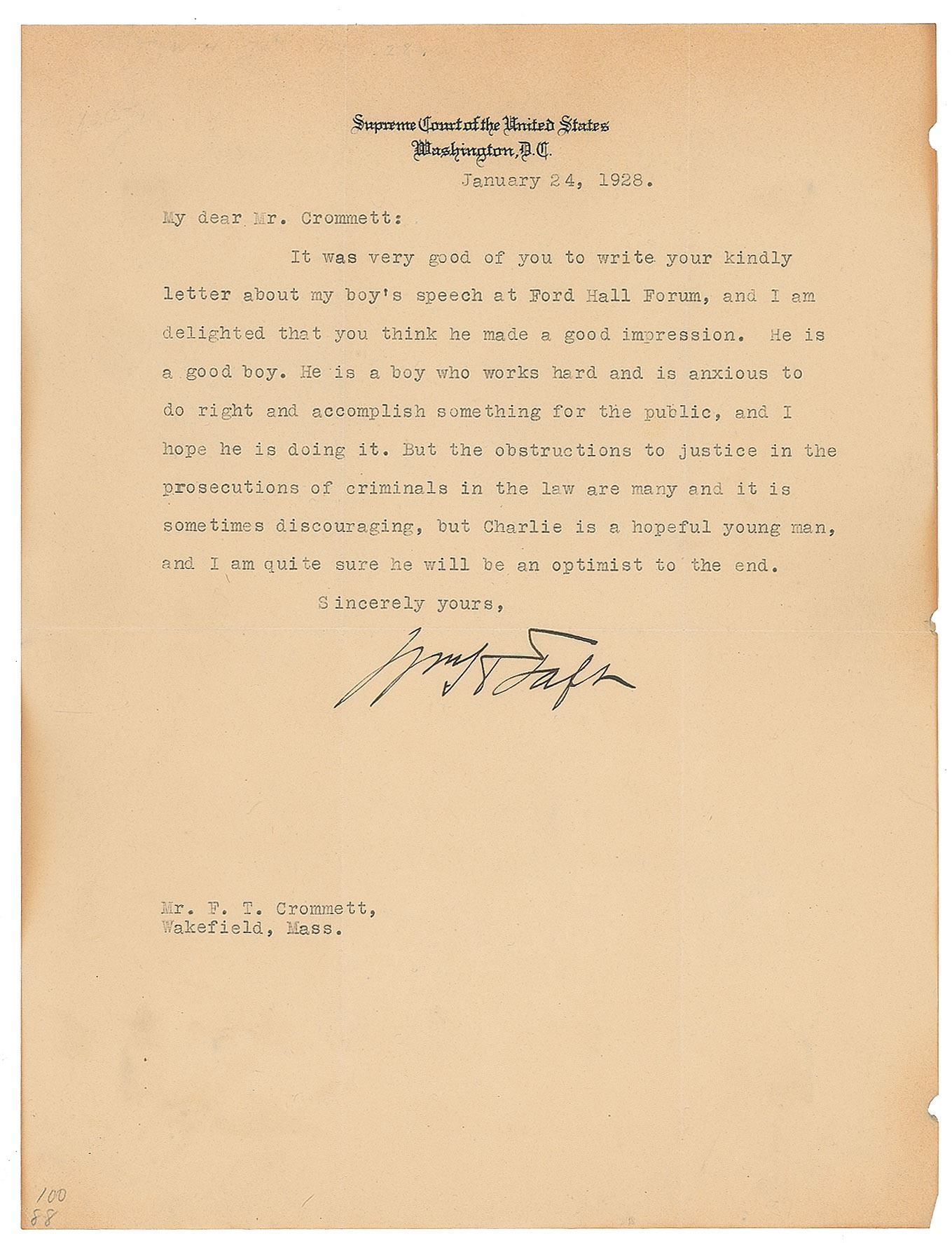 TLS signed “Wm. H. Taft,” one page, 8 x 10.5, Supreme Court of the United States letterhead, January 24, 1928. Letter to F. T. Crommett, in part: "It was very good of you to write your kindly letter about my boy's speech at Ford Hall Forum, and I am delighted that you think he made a good impression. He is a good boy. He is a boy who works hard and is anxious to do right and accomplish something for the public, and I hope he is doing it. But the obstructions to justice in the prosecution of criminals in the law are many and it is sometimes discouraging, but Charlie is a hopeful young man, and I am quite sure he will be an optimist to the end." In fine condition, with edge toning and binder dings to the right edge. Accompanied by an unsigned engraved portrait.