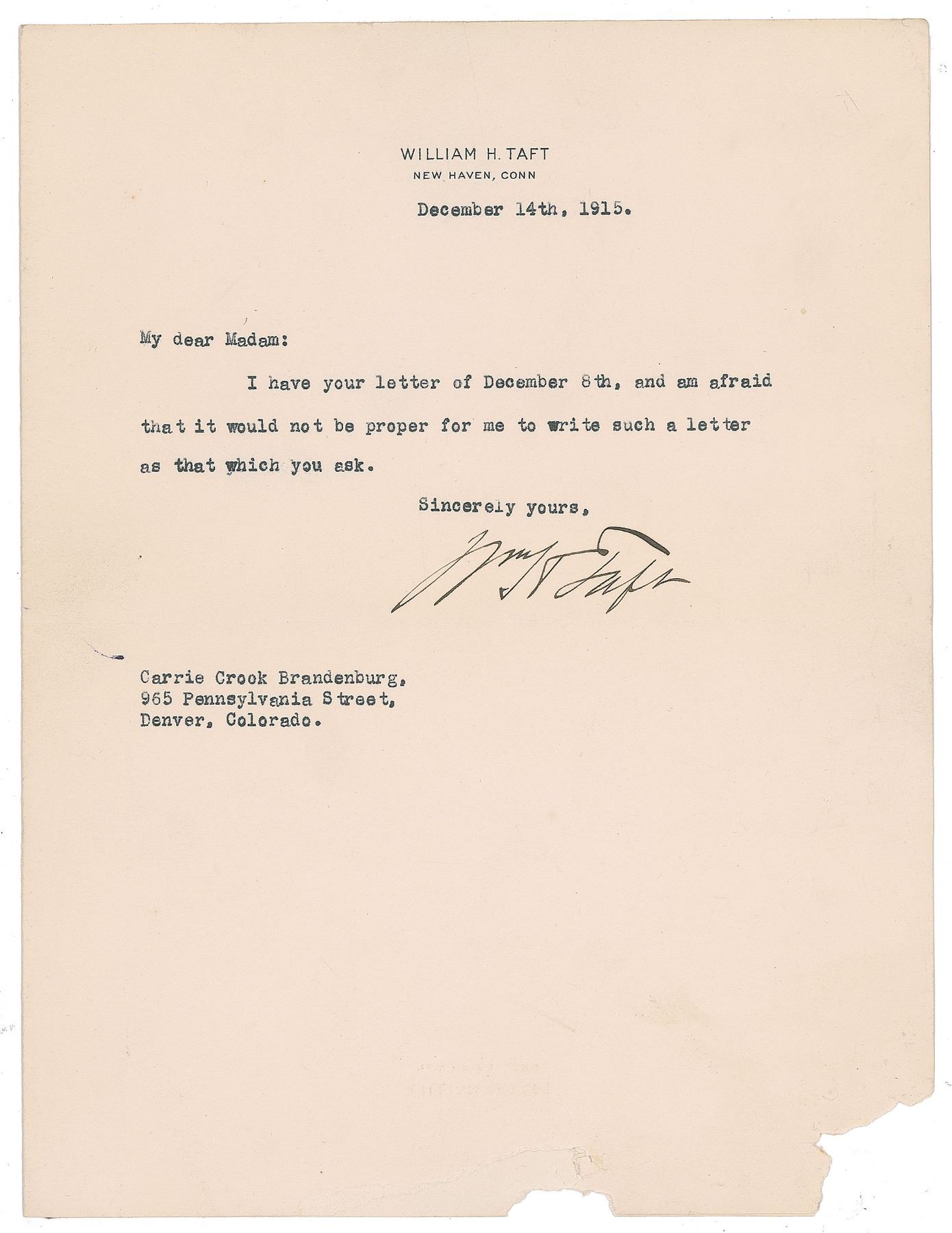 TLS signed “Wm. H. Taft,” one page, 7 x 9.25, personal letterhead, December 14, 1915. Letter to Carrie Crook Brandenburg, in full: "I have your letter of December 8th, and am afraid that it would not be proper for me to write such a letter as that which you ask." In very good to fine condition, with paper loss to the bottom. Accompanied by the original mailing envelope, which is sealed with a 1915 American Red Cross Christmas stamp.