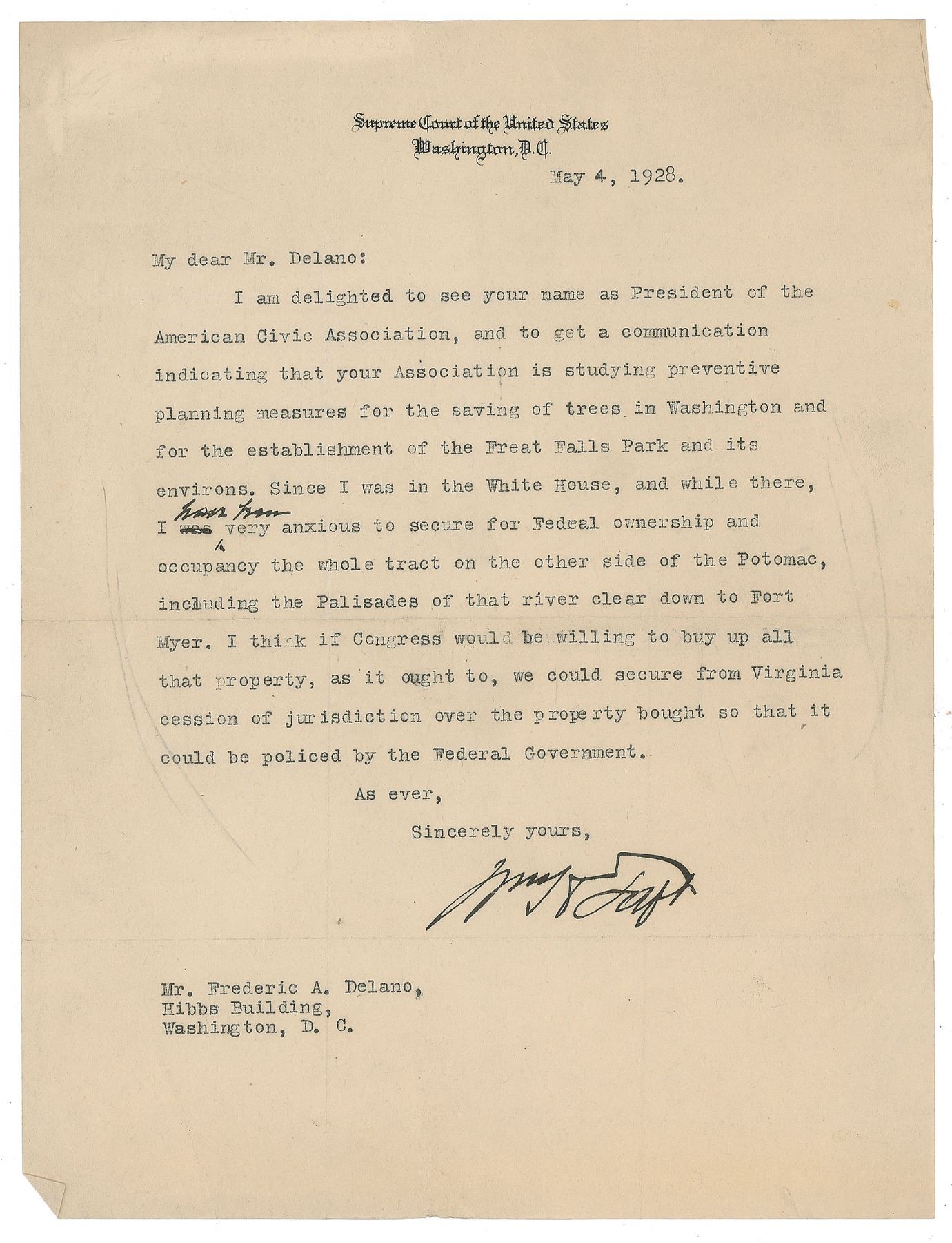 TLS signed “Wm. H. Taft,” one page, 8 x 10.5, Supreme Court of the United States letterhead, May 4, 1928. Letter to Frederic Adrian Delano, a philanthropist, railroad president, and the uncle to President Franklin D. Roosevelt, in full: "I am delighted to see your name as President of the American Civic Association, and to get a communication indicating that your Association is studying preventive planning measures for the saving of trees in Washington and for the establishment of the Great Falls Park and its environs. Since I was in the White House, and while there, I [have been] very anxious to secure for Federal ownership and occupancy the whole tract on the other side of the Potomac, including the Palisades of that river clear down to Fort Myer. I think if Congress would be willing to buy up all that property, as it ought to, we could secure from Virginia cession of jurisdiction over the property bought so that it could be policed by the Federal Government." In very good to fine condition, with intersecting folds and overall creasing.