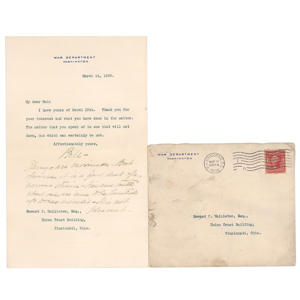 TLS signed “Bill,” one page, 5.5 x 9, War Department letterhead, March 14, 1908. Letter to Howard C. Hollister, in full: "I have yours of March 12th. Thank you for your interest and what you have done in the matter. The matter that you speak of is one that will not down, but which can certainly be met." He adds a handwritten postscript: "Things are moving on—But of course it is a good deal of a nervous strain—Lies and Truth about one are sure to be hunted up to ones discredit—It is not pleasant." In fine condition. Accompanied by the original mailing envelope.