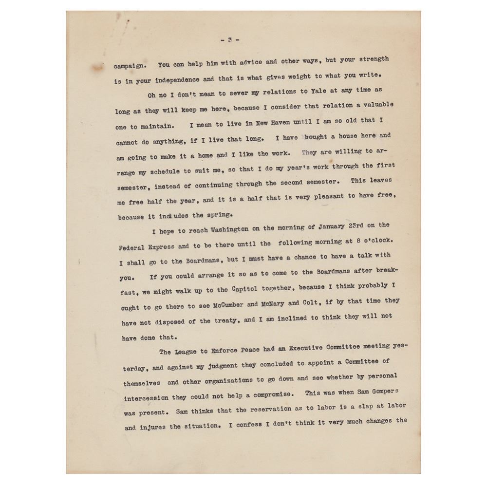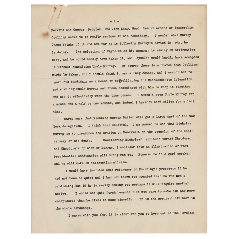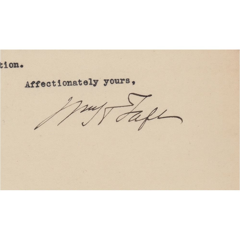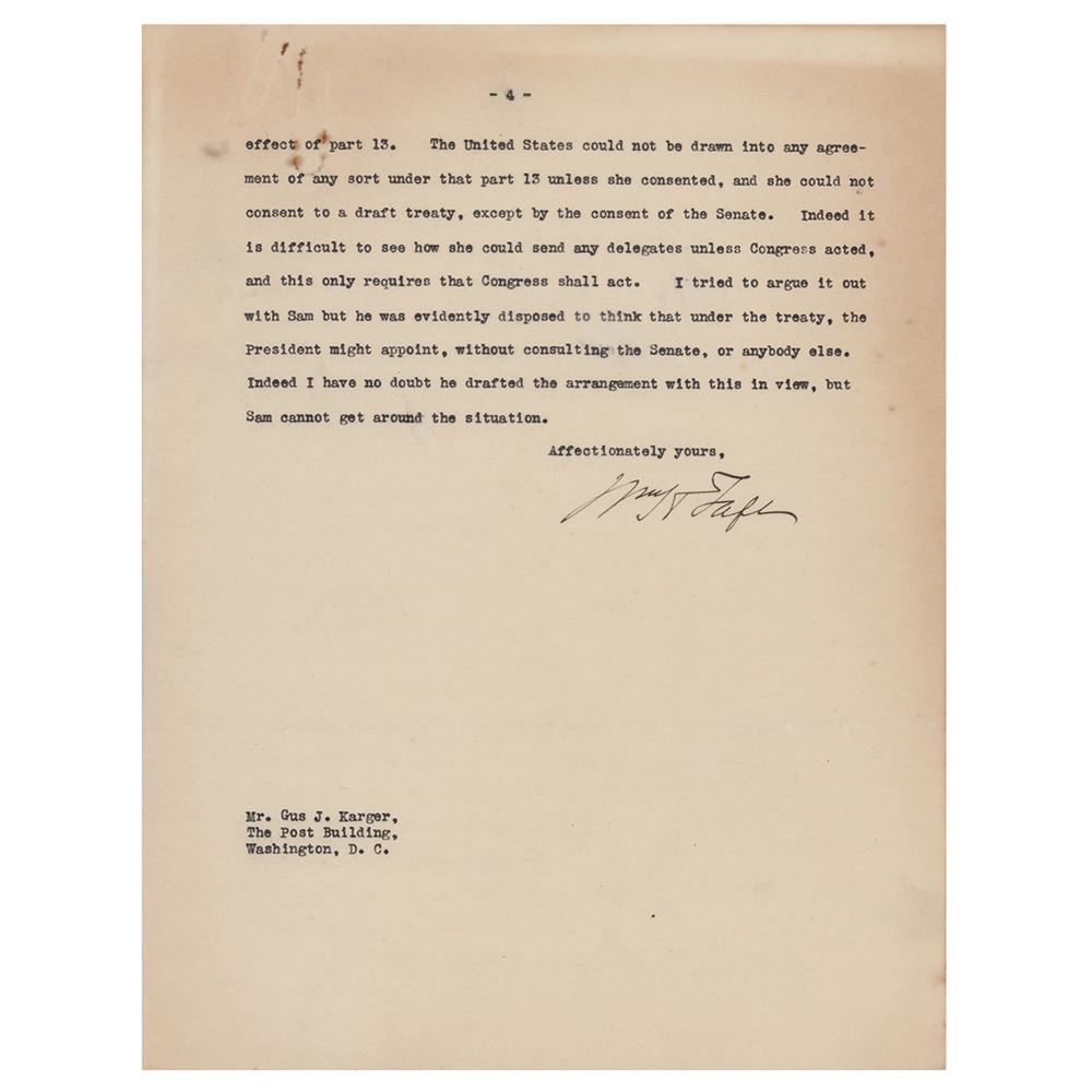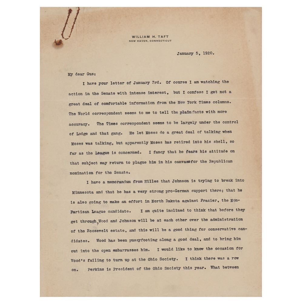 TLS signed "Wm. H. Taft," four pages, 8 x 10.5, personal letterhead, January 5, 1920. Letter to newspaper correspondent Gus J. Karger, discussing the Senate's evaluation of the League of Nations and the impending 1920 presidential election. In part: "Of course I am watching the action in the Senate with interest, but I confess I get not a great deal of information from the New York Times columns. The World correspondent seems to me to tell the plain facts with more accuracy. The Times correspondent seems to be largely under the control of Lodge and that gang‰Û_Coolidge seems to be really serious in his candidacy‰Û_I am amused to see that Nicholas Murray is to pronounce the oration on Roosevelt on the occasion of the anniversary of his death. Considering Nicholas' attitude toward Theodore, and Theodore's opinion of Murray, I consider this an illustration of what Presidential candidacies will bring men to‰Û_I agree with you that it is wiser for you to keep out of the Harding campaign. You can help him with advice and other ways, but your strength is in your independence and that is what gives weight to what you write." In very good to fine condition, with slightly irregular light toning, and rusty paperclip impressions to the top edge.