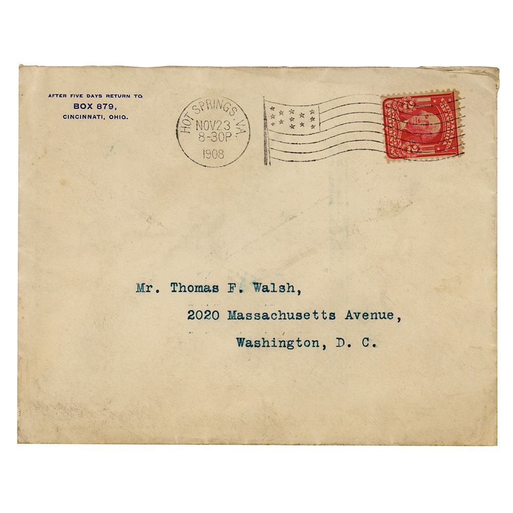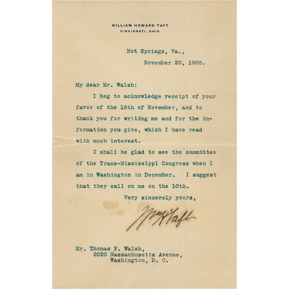 TLS as president-elect, signed “Wm. H. Taft,†one page, 5.25 x 8.5, personal letterhead, November 20, 1908. Letter to Thomas F. Walsh, in part: "Thank you for writing me and for the information that you give, which I have read with much interest. I shall be glad to see the committee of the Trans-Mississippi Congress when I am in Washington in December. I suggest that they call on me on the 10th." In very good to fine condition, with some light staining and overall haloing to ink. Accompanied by the original mailing envelope.