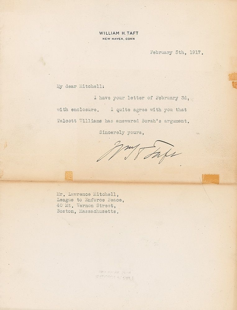 TLS signed “Wm. H. Taft,” one page, 7 x 9.25, personal letterhead, February 5, 1917. Brief letter to Lawrence Mitchell of the League to Enforce Peace. In full: “I have your letter of February 3d, with enclosure. I quite agree with you that Talcott Williams has answered Borah’s argument.” In very good condition, with scattered toning, tape remnants around text, and light mirroring of letterhead along bottom.