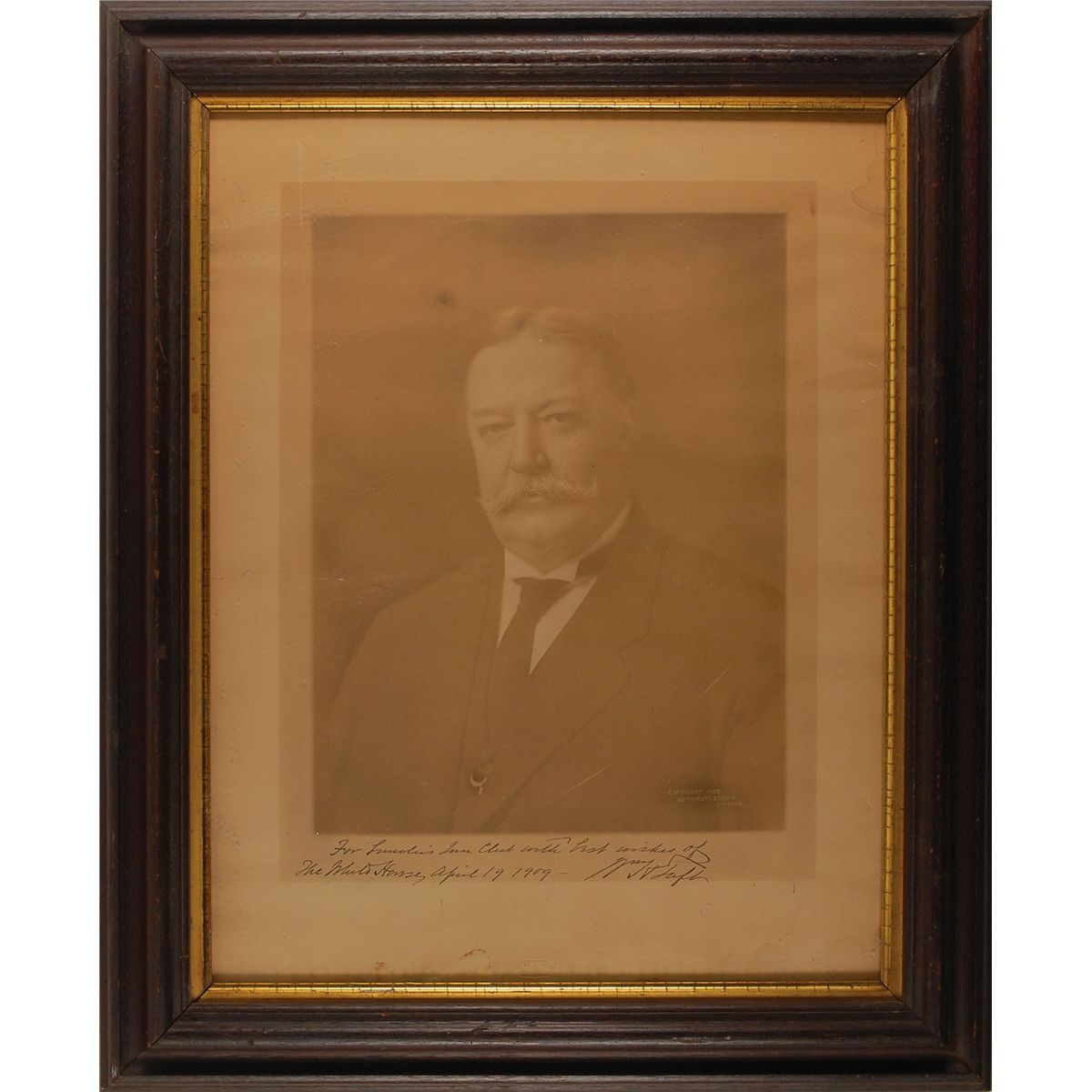 Distinguished vintage matte-finish 14 x 18 portrait of President Taft by Moffett Studio of Chicago, signed and inscribed in the lower border in black ink as president, “For Lincoln’s Inn Club with best wishes of Wm. H. Taft, The White House, April 19, 1909.” Nicely framed to an overall size of 19 x 23. In very good condition, with a faint tear to the left border extending into the image, some dampstaining to borders, and the image a bit faded. The Lincoln’s Inn Club was founded in 1907 as the only social club based at Harvard Law School. An impressive portrait, this is among the largest Taft photos we have offered.