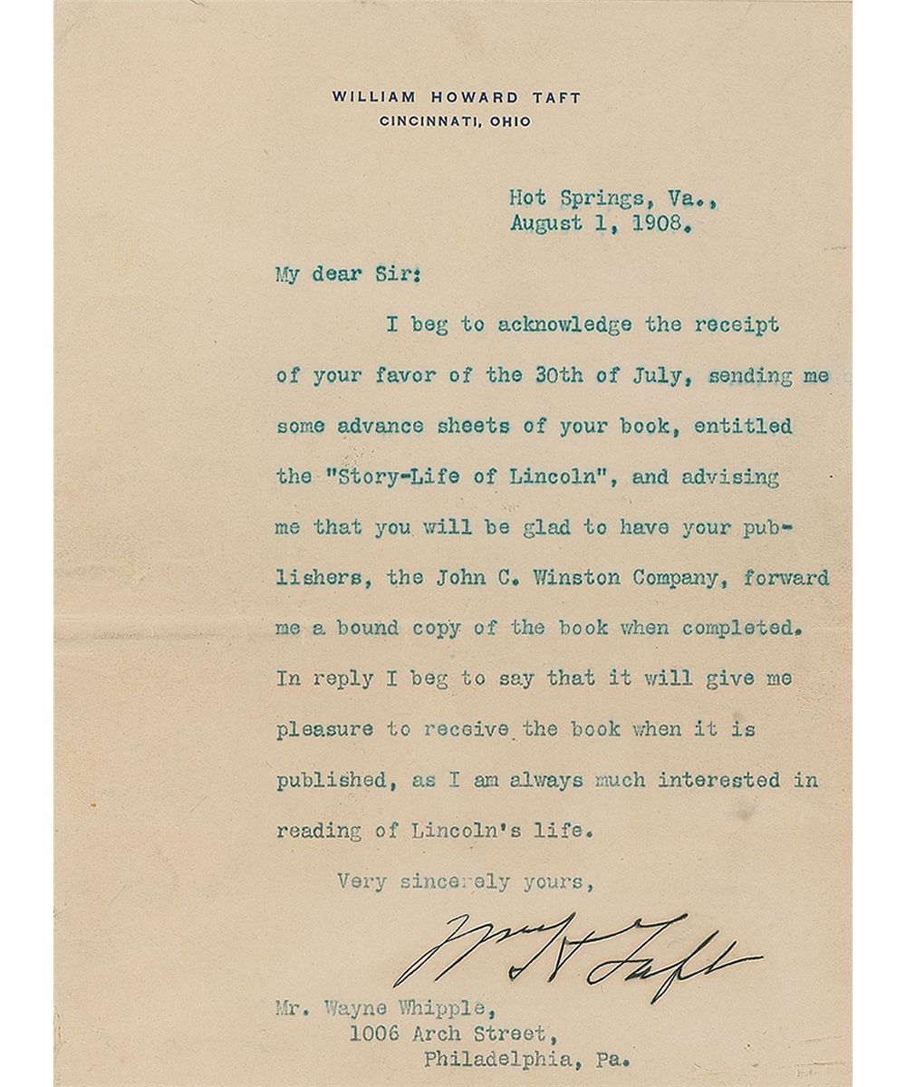 TLS signed “Wm. H. Taft,” one page, 5.25 x 7, personal letterhead, August 1, 1908. Letter to author Wayne Whipple. In part: “I beg to acknowledge the receipt of…some advance sheets of your book, entitled the ‘Story-Life of Lincoln,’ and advising me that you will be glad to have your publishers, the John C. Winston Company, forward me a bound copy of the book when completed…It will give me much pleasure to receive the book when it is published, as I am always much interested in reading of Lincoln’s life.” In fine condition, with scattered creases.