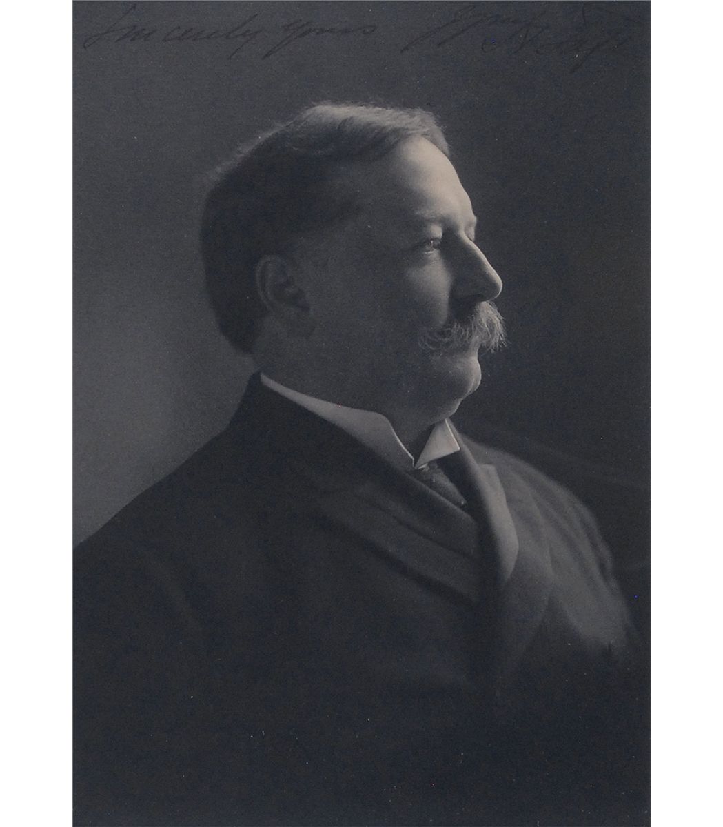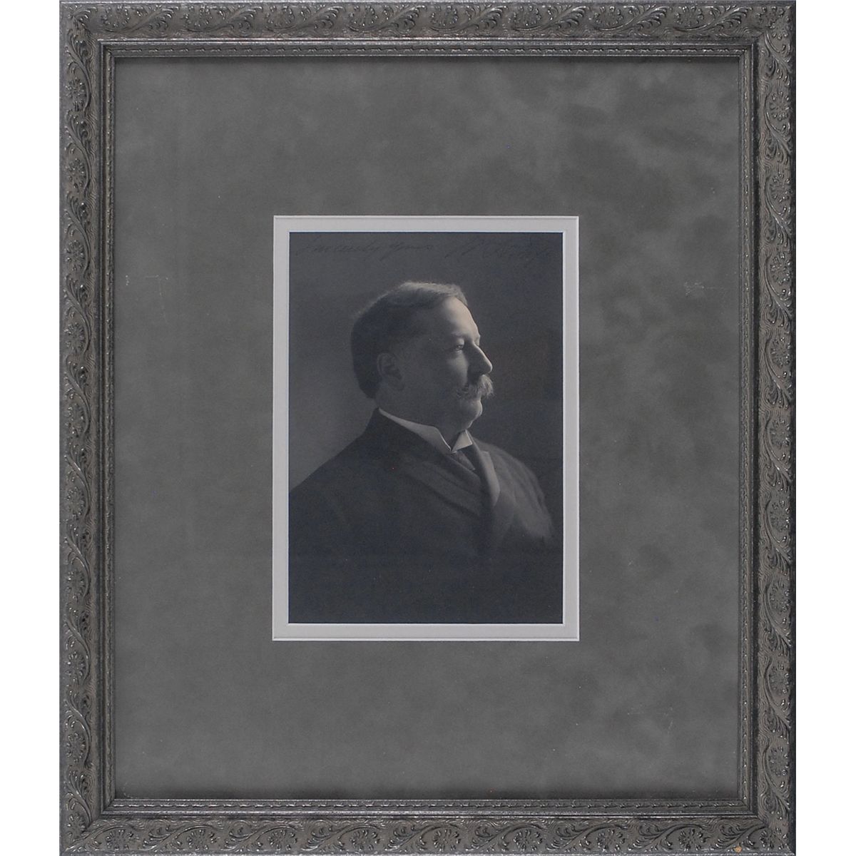 Stately matte-finish 5.25 x 7.5 profile photo, signed across the top in black ink, “Sincerely yours, Wm. H. Taft.” Double-suede-matted and framed to an overall size of 14 x 16.25. Moderate contrast to signature and sentiment, otherwise fine condition.