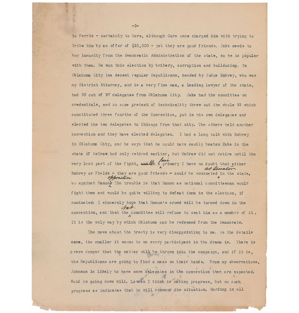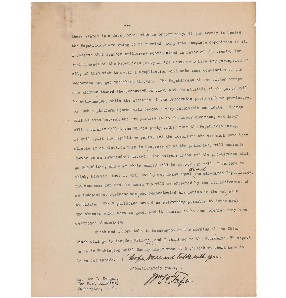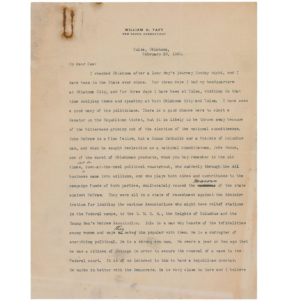 TLS signed “Wm. H. Taft,” four pages, 8 x 10.5, personal letterhead, February 23, 1920. Letter to newspaper correspondent Gus Karger. In part: “I reach Oklahoma after a long day’s journey…I have seen a good many of the politicians. There is a good chance here to elect a Senator on the Republican ticket, but it is likely to be thrown away because of the bitterness growing out of the election of the national committeeman. John McGraw is a fine fellow, but a Roman Catholic and a Knights of Columbus man, and when he sought reelection as a national committeeman, Jake Hamon, one of the worst of Oklahoman products, whom you may remember in the old times as a down-at-the-heel political roustabout, who suddenly through the oil business came into millions, and who plays both sides and contributes to the campaign funds of both parties, deliberately roused the Masons of the state against McGraw…Jake is a man who boasts of his infidelities among women and says they make him popular with them. He is a corrupter of everything political. He is a strong arm man…It is of no interest to him to have a Republican Senator…The news about the treaty is very disappointing to me. As the details come, the smaller it seems to me every participant in the drama is. There is grave danger that the matter will be thrown into the campaign, and if it is, the Republicans are going to find a mess on their hands…Johnson is likely to have more delegates in the convention than are expected. Wood is going down hill. Lowden I think is making progress, but no such progress as indicates that he will command the situation. Harding in all these states is a dark horse, with an opportunity.” Taft has made several handwritten corrections to the text, and also added a closing which reads, “I hope to see and talk with you.” In very good condition, with intersecting folds, one through a single letter of signature, rusty paperclip marks and impressions to top edge, and light overall toning, with a heavier area of toning to top left corner. Two of the men mentioned in this letter emerged as the forerunners for the 1920 Republican nomination, General Leonard Wood of New Hampshire and Illinois governor Frank Lowden. The party heads were not convinced of the viability of either, and Harding—then serving as a senator for Ohio—began to emerge as a possibility. A fabulous letter packed with local and national political content, with Taft accurately predicting a Harding victory later in the year.