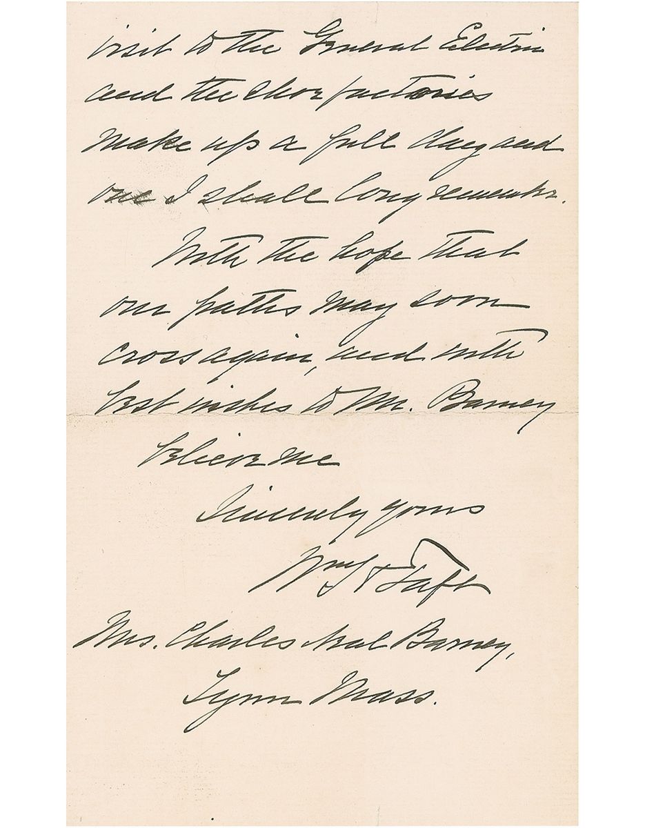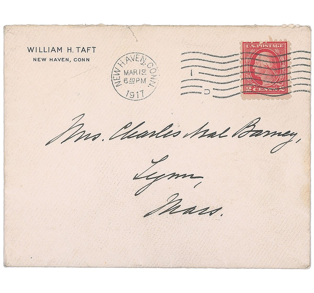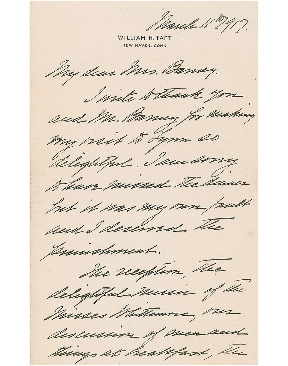 ALS signed “Wm. H. Taft,” two pages on two adjoining sheets, 5 x 8, personal letterhead, March 17, 1917. Letter to Mrs. Charles Neal Barney. In full: “I write to thank you and Mr. Barney for making my visit to Lynn [Massachusetts] so delightful. I am sorry to have missed the dinner but it was my own fault and I deserved the punishment. The reception, the delightful music of the Misses Whittemore, our discussion of men and things at breakfast, the visit to the General Electric and the shoe factories make up a full day and one I shall long remember. With the hope that our paths may soon cross again, and with best wishes to Mr. Barney.” In fine condition, with a trivial tear to bottom edge of second page. Accompanied by the original mailing envelope, addressed in Taft’s hand.