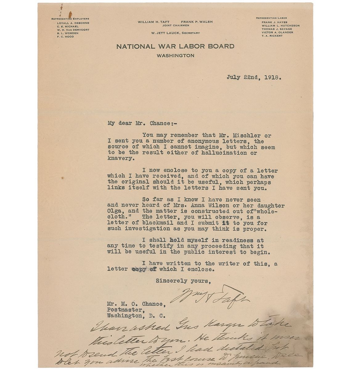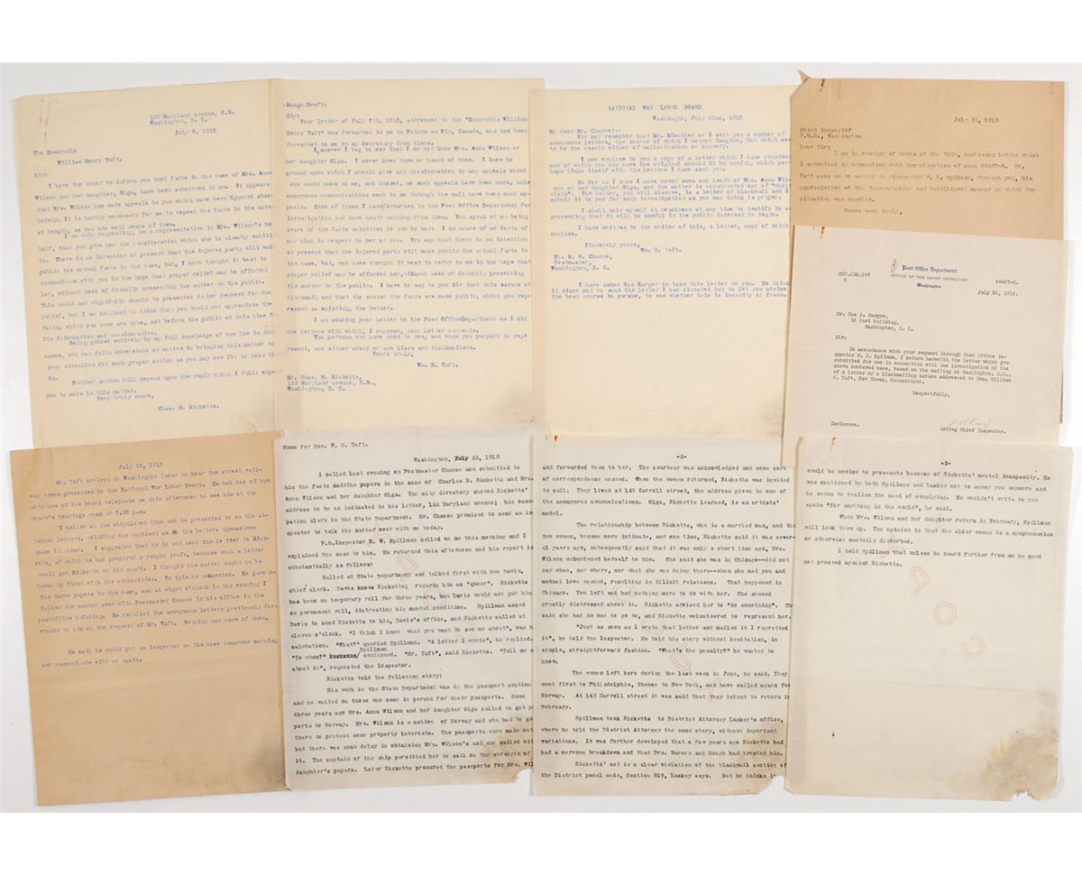 TLS signed “Wm. H. Taft,” one page, 8 x 10.5, National War Labor Board letterhead, July 22, 1918. Letter to Postmaster M. O. Chance. In part: “You may remember that Mr. Mischler or I sent you a number of anonymous letters, the source of which I cannot imagine, but which seem to be the result either of hallucination or knavery…So far as I know I have never seen and never heard of Mrs. Anna Wilson or her daughter Olga, and the matter is constructed out of ‘whole-cloth.’ The letter, you will observe, is a letter of blackmail and I submit it to you for such investigation as you may think is proper.” At the end, Taft pens a handwritten postscript: “I have asked Gus Karger to take this letter to you. He thinks it wiser not to send the letter I had dictated but to let you advise the best course to pursue, to see whether this is insanity or fraud.” In very good condition, with a rusty paperclip mark to the upper left and dampstaining to the lower right corner (affecting a portion of the handwritten postscript). Accompanied by several typed copies of correspondence related to the case, including one of the letters from Charles Ricketts that prompted Taft’s inquiry. Ricketts’s letter, in part: “Mrs. Wilson has made appeals to you which have been ignored...I have thought it best to communicate with you in the hope that proper relief may be afforded her...I am inclined to think that you would not appreciate the facts, which you know are true, set before the public at this time.” An additional carbon copy of a report sent to Taft is also present, stating that Wilson “said she was in Chicago...when she met you and mutual love ensued, resulting in illicit relations.” According to a book recently released in Norway, Den Amerikanske Presidentens Norske Datter [The American President’s Norwegian Daughter], Anna Wilson had traveled to the United States in 1892 and returned home to Norway alone, only to give birth to a daughter, Olga, in April 1894. Though the mystery remains unresolved, it is speculated that Taft may have been Olga Wilson’s biological father. An exceptional letter with supporting documents concerning this would-be Washington scandal.
