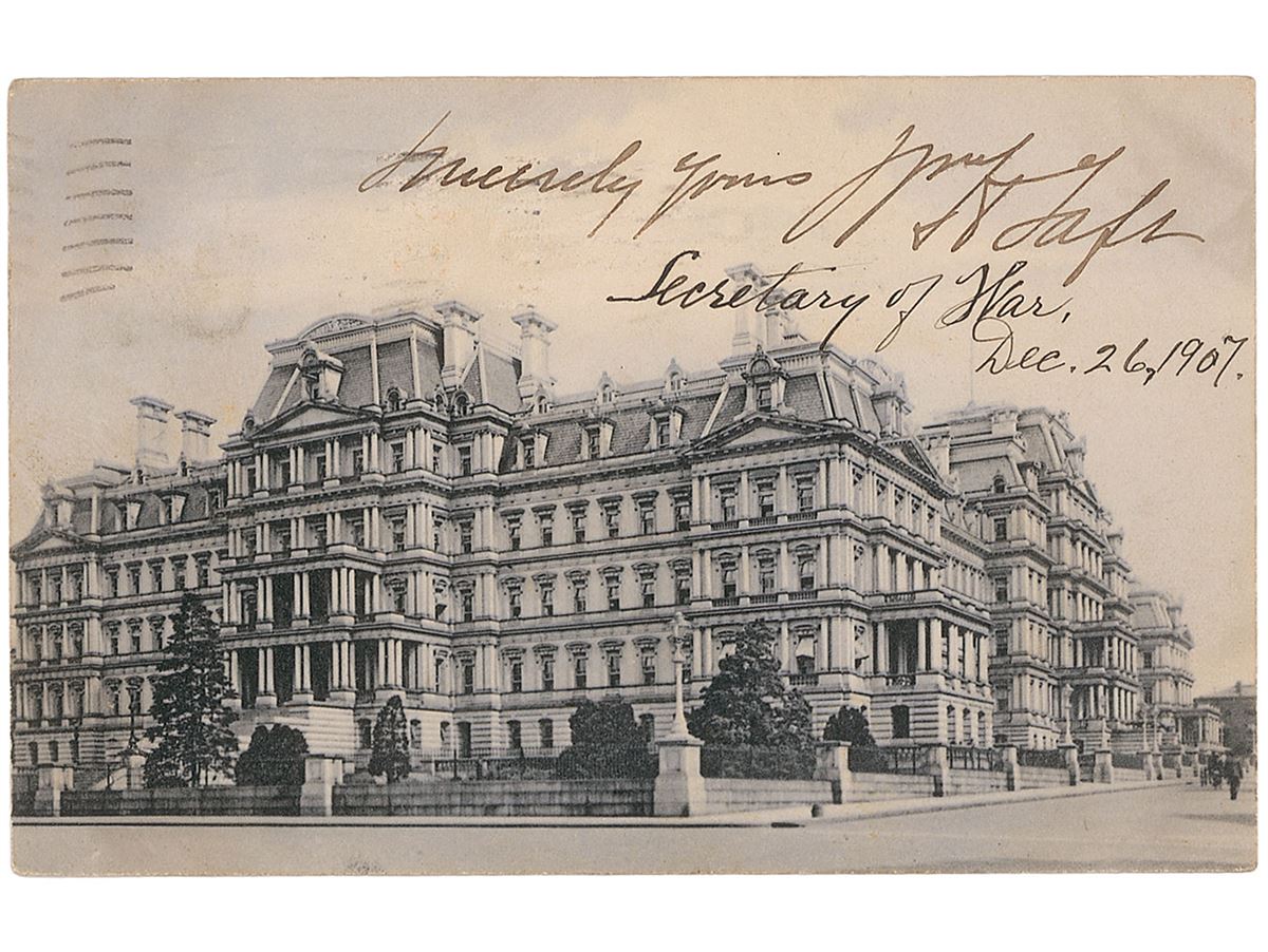 Postcard photo of the State, War, and Navy building in Washington, D.C., 5.5 x 3.5, signed in fountain pen, “Sincerely yours, Wm. H. Taft,” with a collector’s notation, “Secretary of War, Dec. 26, 1907,” written below. Light soiling and some wear to corners, otherwise fine condition.