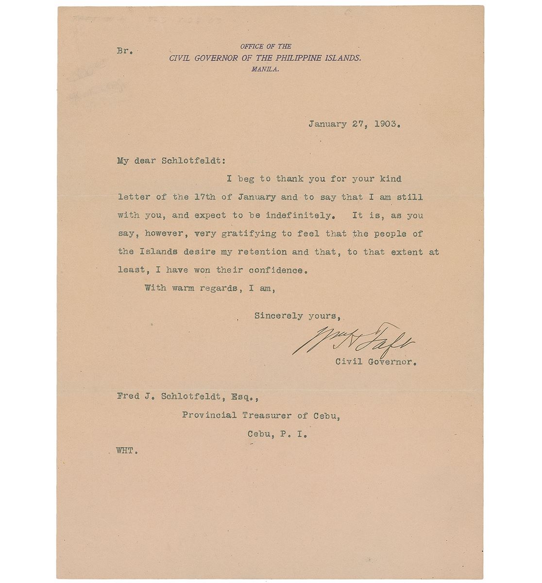 TLS signed “Wm. H. Taft,” one page, 7.75 x 10.5, Office of the Civil Governor of the Philippine Islands letterhead, January 27, 1903. Letter to Fred J. Schlotfeldt, in full: “I beg to thank you for your kind letter of the 17th of January and to say that I am still with you, and expect to be indefinitely. It is, as you say, however, very gratifying to feel that the people of the Islands desire my retention and that, to that extent at least, I have won their confidence.” In fine condition, with erased pencil notations to upper left corner. Taft served as the first civilian Governor-General of the Philippines from 1901 to 1904, helping organize a government in the recently annexed islands.