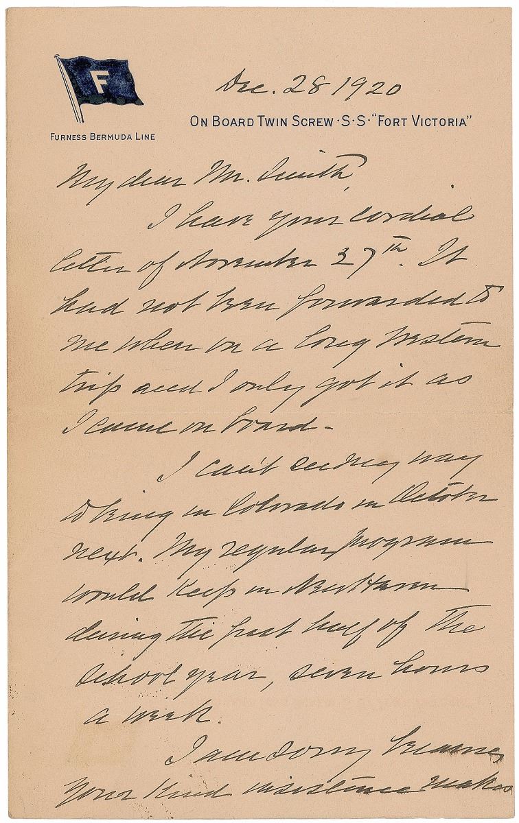 ALS signed “Wm. H. Taft,” two pages on two adjoining sheets, 5 x 8, On Board Twin Screw S.S. ‘Fort Victoria’ letterhead, December 28, 1920. Letter to Henry Smith, Secretary of the Colorado Education Association. In full: “I have your cordial letter of November 27th. It had not been forwarded to me when on a long western trip and I only got it as I came on board. I can’t see my way to being in Colorado in October next. My regular program would keep [me] in New Haven during the past half of the school year, seven hours a week. I am sorry because your kind insistence makes me think you really wish me to come.” Small separation to central horizontal fold of second page and light toning otherwise fine condition. Accompanied by the original mailing envelope.