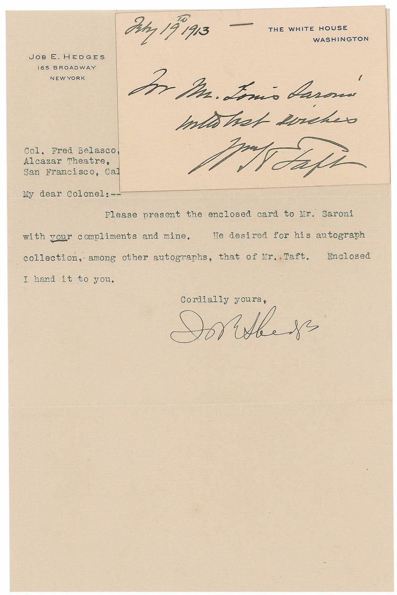 White House card signed and inscribed in black ink, “For Mr. Louis Saroni, with best wishes, Wm. H. Taft, Feby 19th 1913.” Stapled to the top of a transmittal letter addressed to Col. Fred Belasco, Alcazar Theatre, San Francisco. In very good condition, with a diagonal crease passing through the left side.