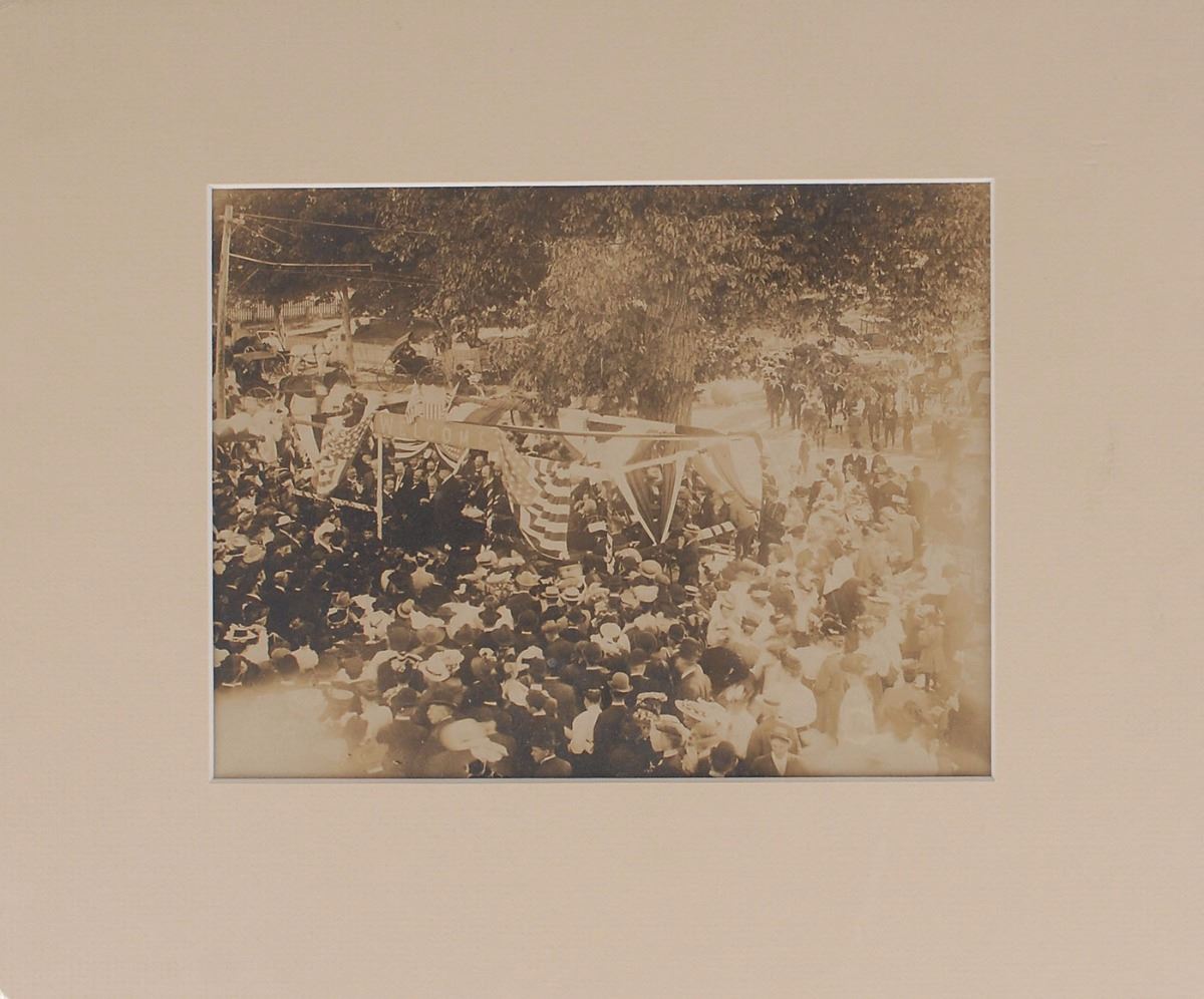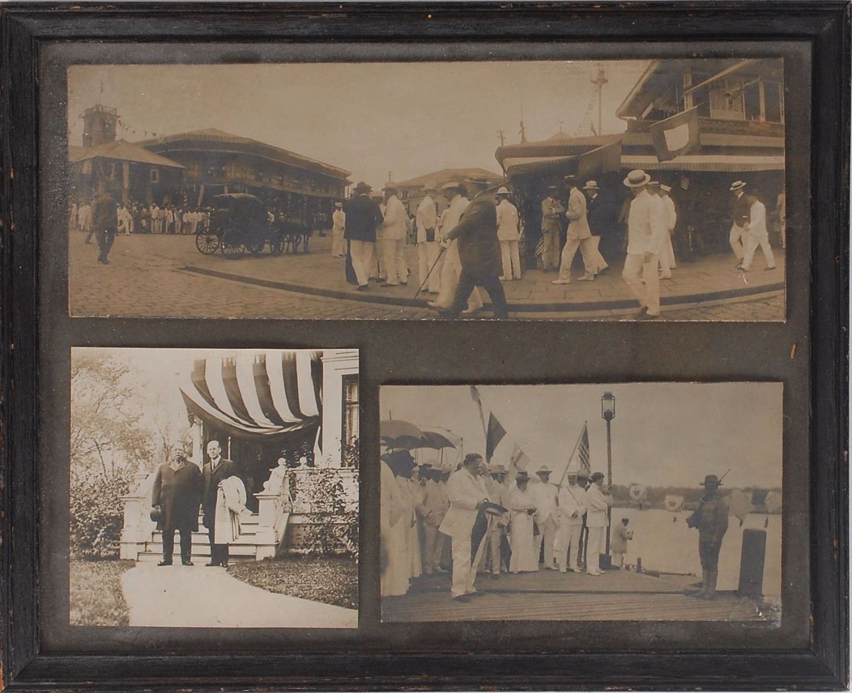 Five original unsigned photos of Taft, ranging in size from 3 x 3 to 9.5 x 7, showing him at various events including on a dock, in a city street, and in a large group. Three are affixed within a single frame and two are individually matted to 14 x 11. In overall fine condition.