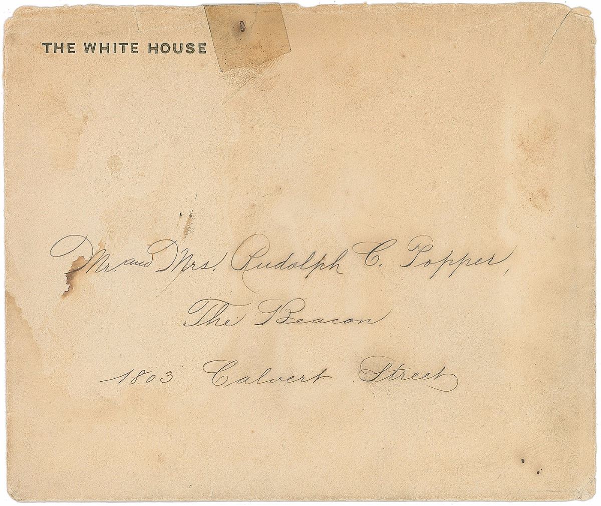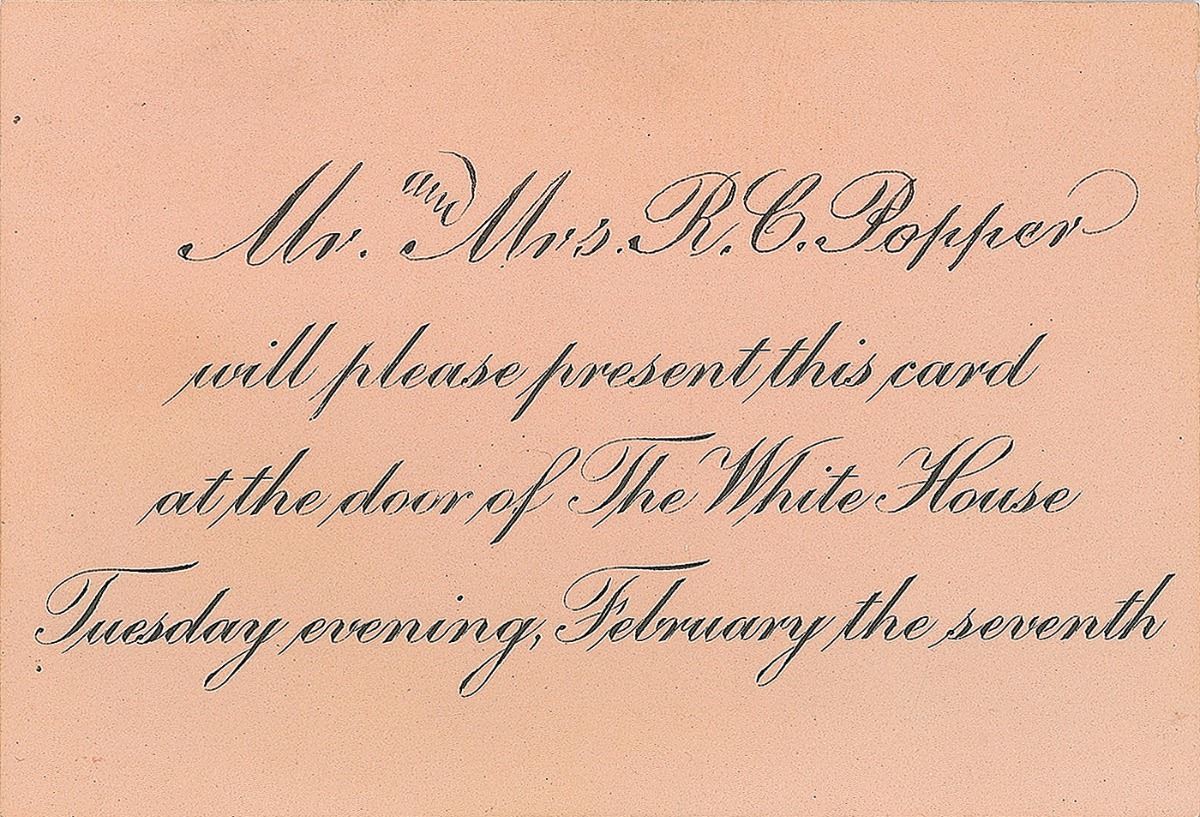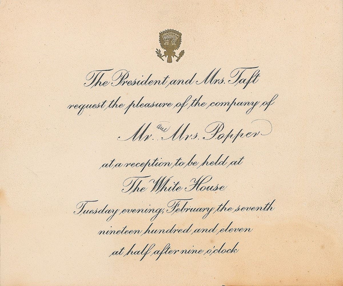 Unsigned partly-printed invitation filled out in another hand, 5.5 x 4.75, February 7, 1911, in part: “The President and Mrs. Taft request the pleasure of the company of Mr. and Mrs. Popper at a reception to be held at the White House.” Includes an admission card, small envelope marked “Not Transferable,” and White House transmittal envelope. In overall fine condition, with some light toning.